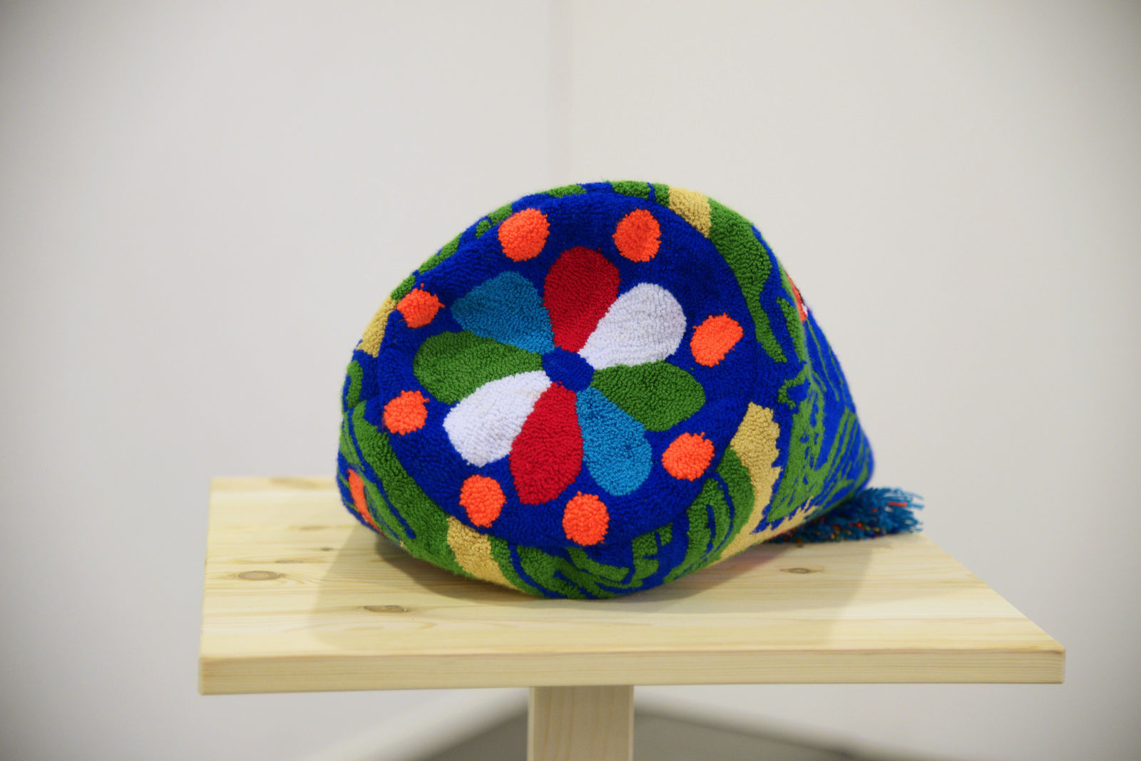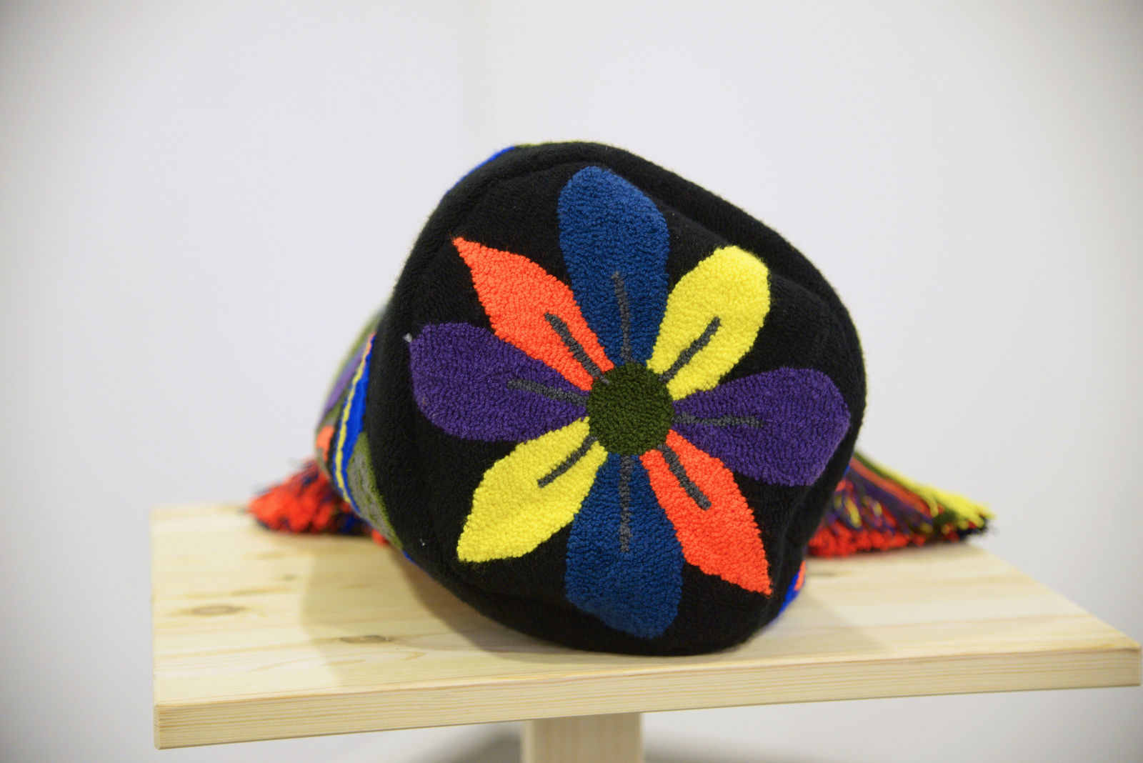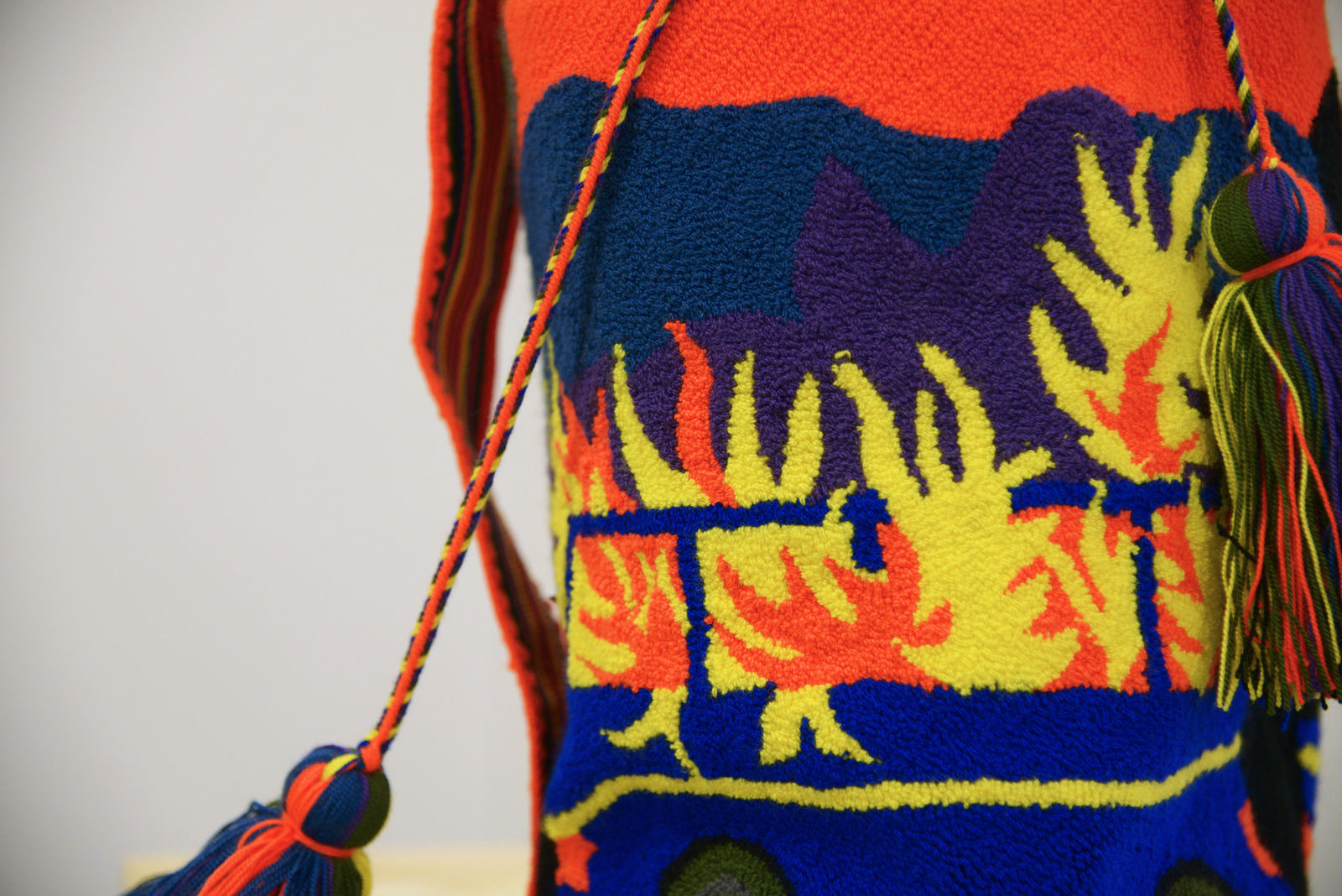 Camilo Sandoval plädiert in seinem künstlerischen Ansatz für eine animistische Perspektive, die die Koexistenz und Symbiose von Mensch und Maschine anerkennt. Seine Abschlussarbeit umfasst verschiedene Werke, die in individuellen wie kollektiven Geschichten auf die aktuelle gesellschaftliche und politische Situation Kolumbiens Bezug nehmen: ein Arcade-Spiel als Karikatur des politischen und sozialen Panoramas, Ponchos in vermeintlich idyllisch-floraler Camouflage-Optik, Hemden mit tropikalischer Barockornamentik generiert aus historischen Daten oder handgearbeitete „Mochila“-Umhängebeutel in leuchtenden Farben mit narrativen und abstrahierten Webmustern, die auf Schilderungen von Opfern des bewaffneten Konflikt zurückgehen. Sandovals LED-Panels „Banderas Alternativas para Colombia“ fügen den zahlreichen Entstehungsmythen über die kolumbianische Nationalflagge – Gelb für die Bodenschätze, Blau wie die beiden Ozeane und Rot für das vergossene Blut im Kampf um die Unabhängigkeit – weitere aktuelle Lesarten und damit potentielle Entwicklungen des Landes hinzu.