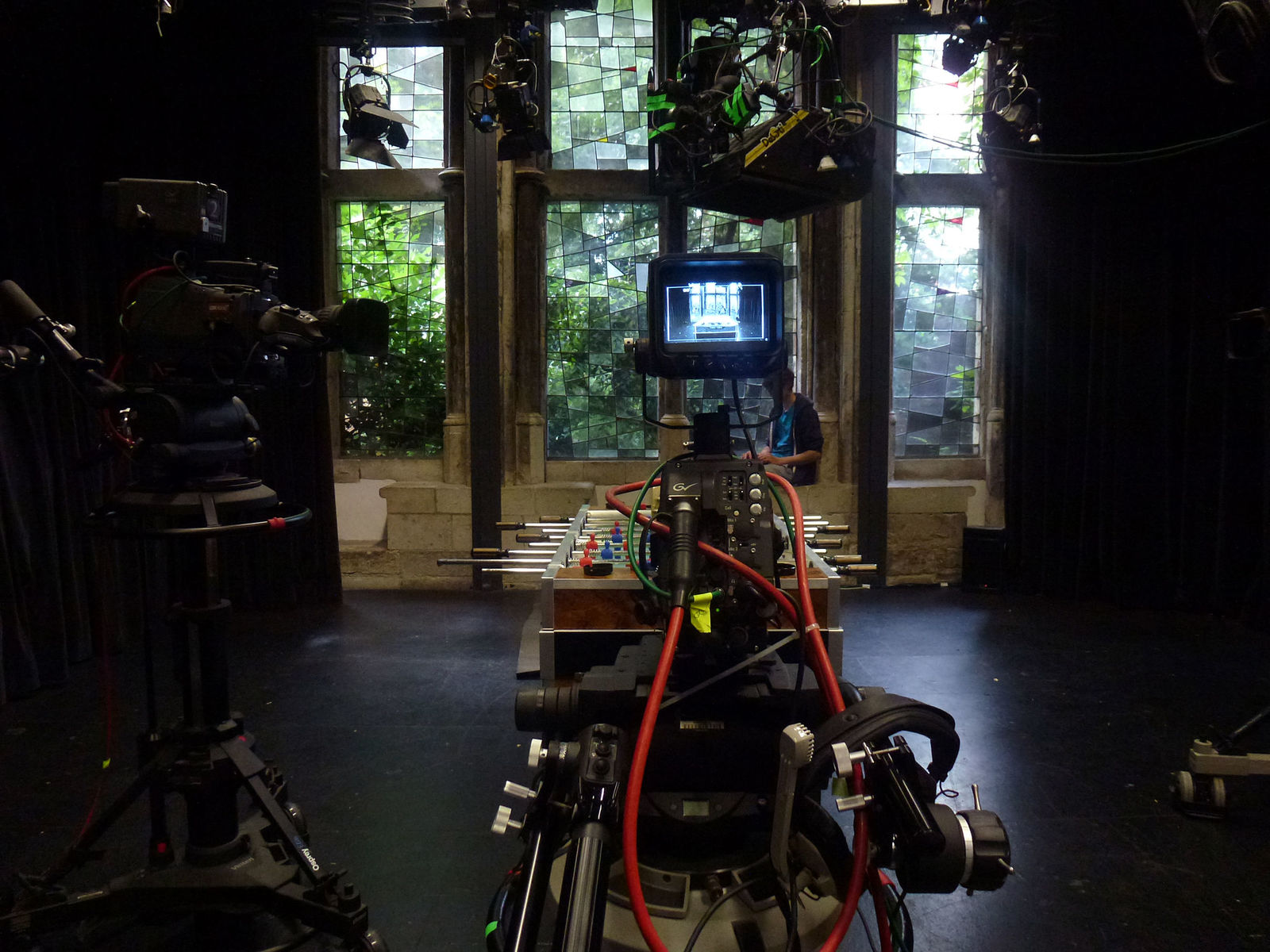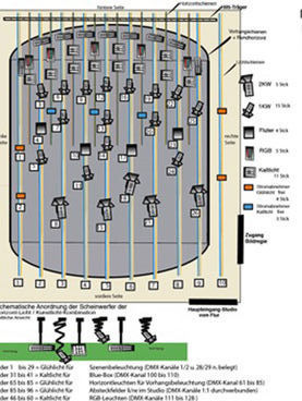Integration of make-up and props rooms as well as a complex studio lighting system with ceiling rail lighting and programmable light console, as well as a ten-metre-wide infinity cove for recording effects using keying techniques.