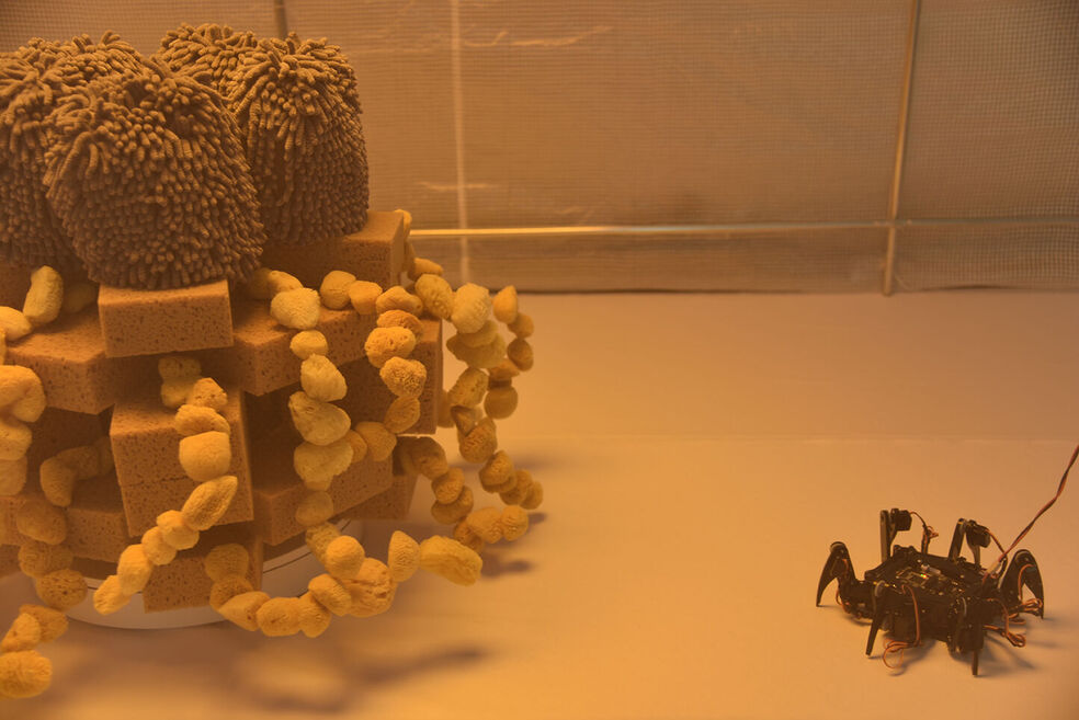 Hye Young Sin, "A seed room", Installation: Gewächshaus, Schwämme, Mikrofaserhandschuh, Hexapod-Roboter, Lautsprecher, Verstärker, Tuch, LED-Panel, Drehteller, Musik: Pedro Ramírez