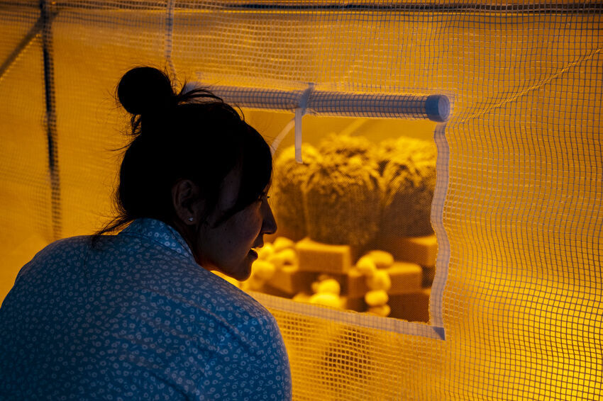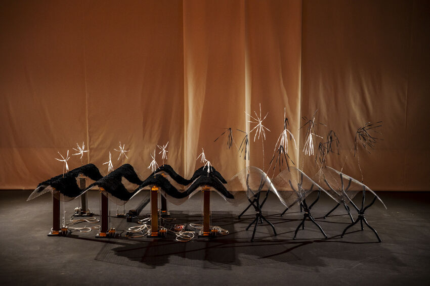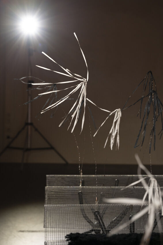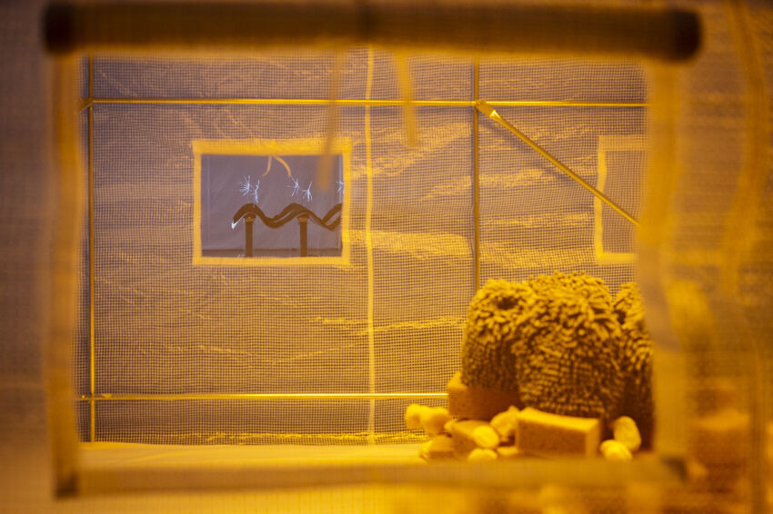 Hye Young Sin, "A seed room", Installation: Gewächshaus, Schwämme, Mikrofaserhandschuh, Hexapod-Roboter, Lautsprecher, Verstärker, Tuch, LED-Panel, Drehteller, Musik: Pedro Ramírez
