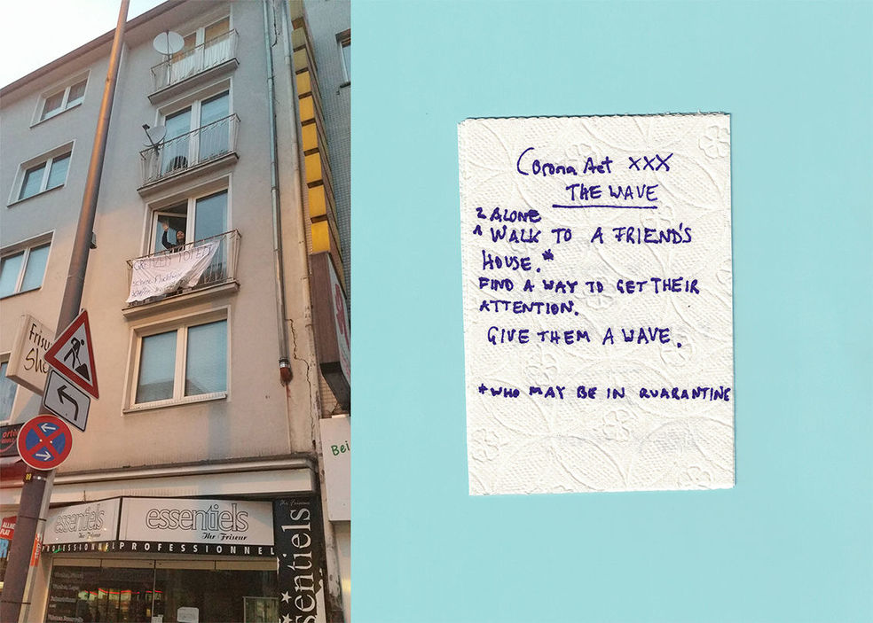 In einem Wohnwagen, in dem sie Mitte März in Köln-Refrath strandete, fand Rike Hoppse eine Restrolle 3-fachlagiges Papier, auf das sie während des Lockdown diverse Handlungsanweisungen für sich und andere notierte. Wie kann Mikroaktivismus, Fürsorge für andere und für sich selbst in einem Pandemie-Alltag stattfinden? Ein fortlaufendes Projekt.