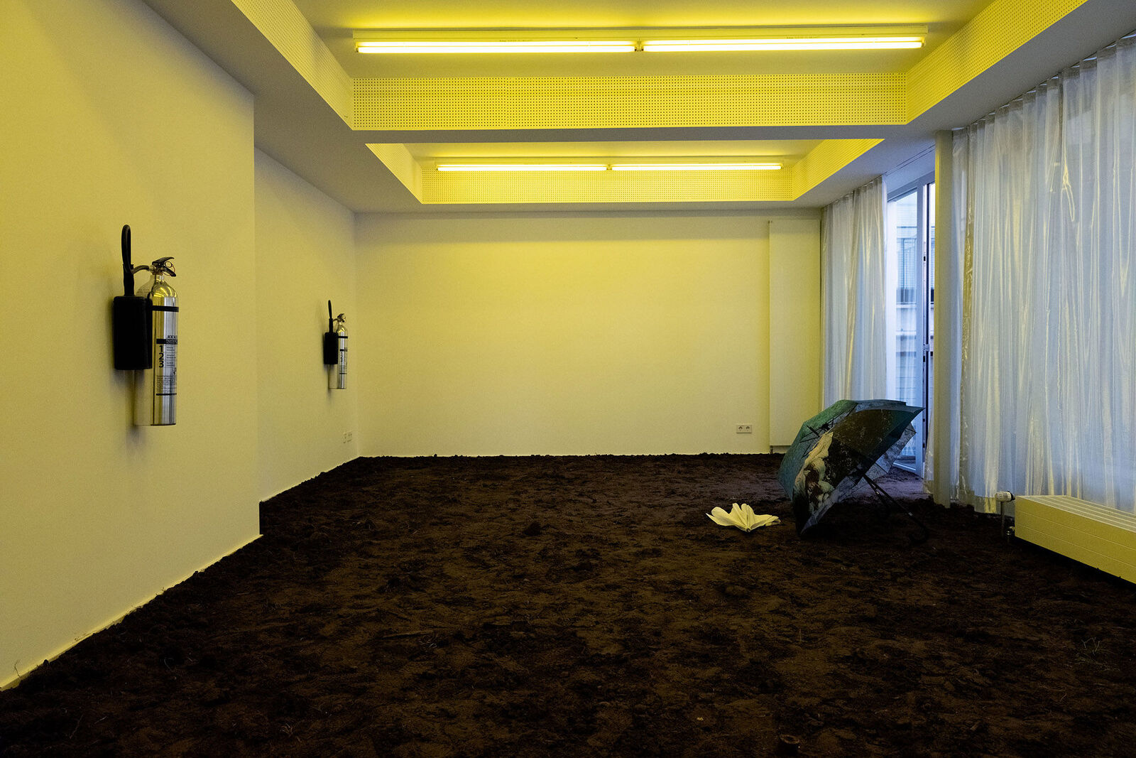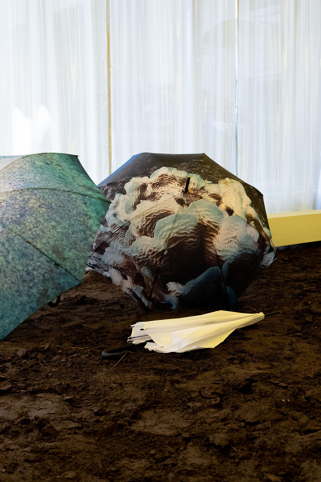 Der Boden eines Raums ist bedeckt mit Erde, die Fensterfront verhangen mit silbernen Thermogardinen. Verchromte Feuerlöscher hängen an den Wänden, auf Regenschirmen Bilder ausgebleichter Korallenriffe. Ein weißes Kleidungsstück scheint auf dem Boden zu zerfließen, es erinnert an eine Steppweste, an eine Schwimmweste, darunter ein halbtransparentes Cape. Feuchtigkeit hängt in der Luft und gelbes Licht über dem Setting.