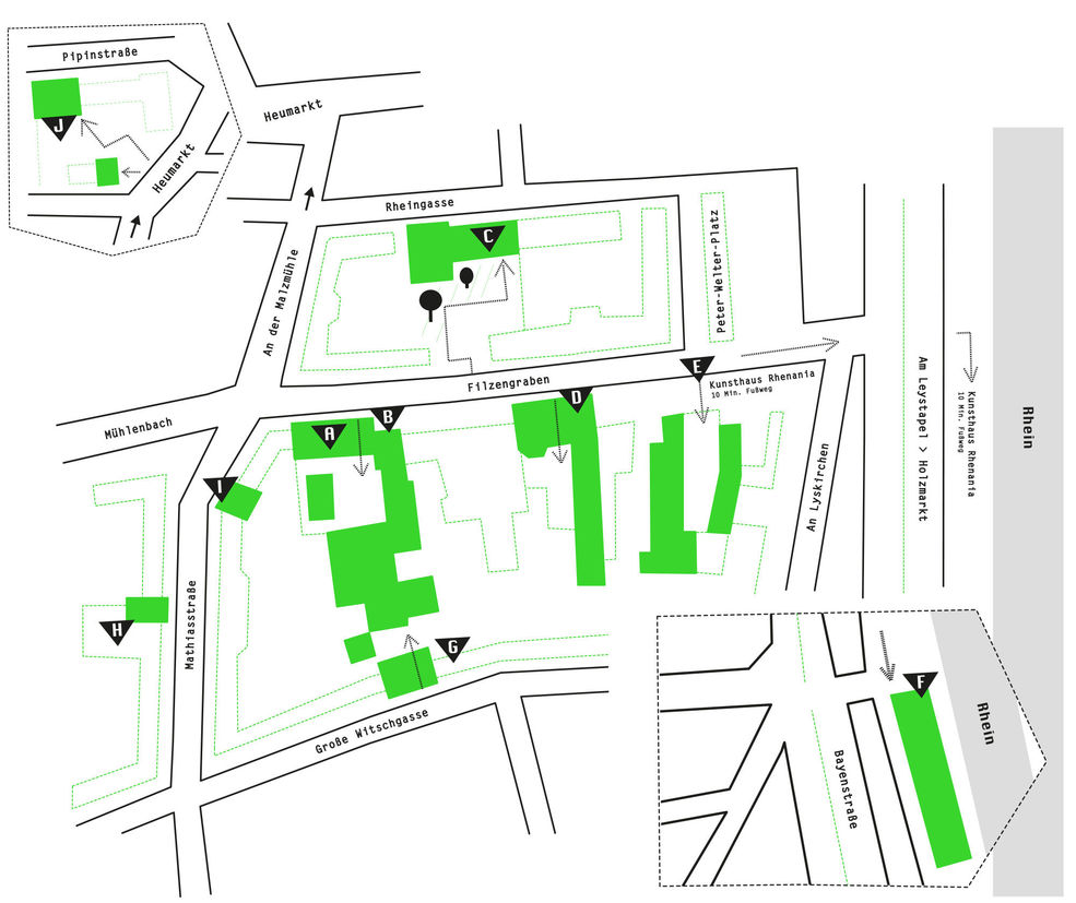 Ateliers, Studios, Labore, Seminarräume oder Produktionsstätten der KHM verbinden sich im Rahmen des Rundgangs zu einem Ausstellungsparcours, der zahlreiche Gebäude der Kunsthochschule umfasst, aber auch Räume in der näheren Nachbarschaft miteinbezieht, wie z.B. ein temporär genutztes Ladenlokal am Malzbüchel. Mit den Ausstellungsräumen MATJÖ (Mathiasstraße 15) und der Ausstellungshalle des Kunsthaus Rhenania (Bayenwerft 28), nur knapp 10 Minuten zu Fuß entfernt im Rheinauhafen, sind 2018 auch wieder zwei externe Ausstellungssatelliten dabei.