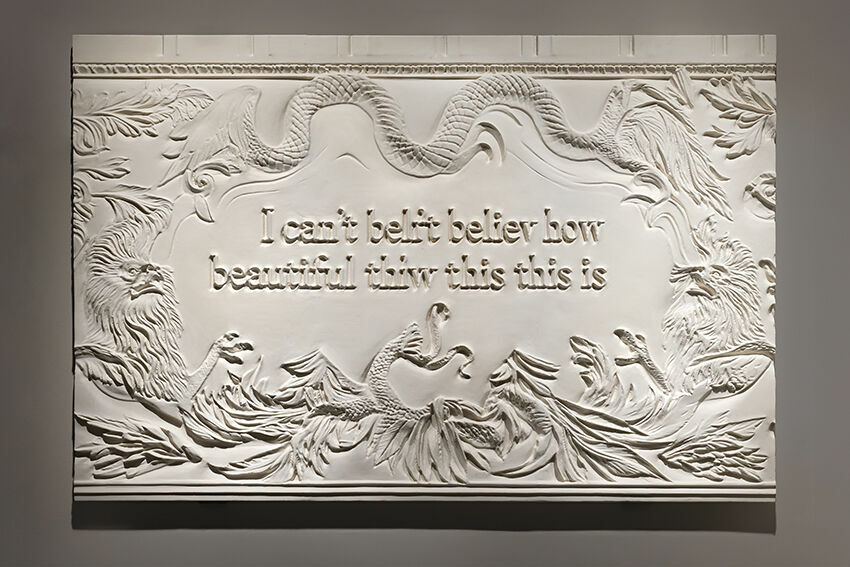 Die Arbeit i can’t believe how beautiful this is wurde als Intervention in die Gipsabguss-Sammlung des Paul-Clemen-Museums entwickelt, das dem Kunsthistorischen Institut der Universität Bonn angegliedert ist. Grundlage ist ein Prompt aus dem Bildgenerator Midjourney, der von Nutzer*innen zur Erzeugung bestimmter Ästhetiken und zugleich vom System selbst zur Beschreibung generierter Inhalte genutzt wird. Das Prompt wurde zurück an den Bildgenerator gegeben, um ein Relief mit entsprechender Inschrift zu erzeugen, das anschließend in ein physisches Objekt überführt und als Gipsabguss realisiert wurde. Der Abguss verweist auf die Konstruktion ästhetischer Normen und dokumentiert eine frühe Phase der Text-zu-Bild-Generatoren, in der Sprache im Bild noch fehlerhaft erscheint.