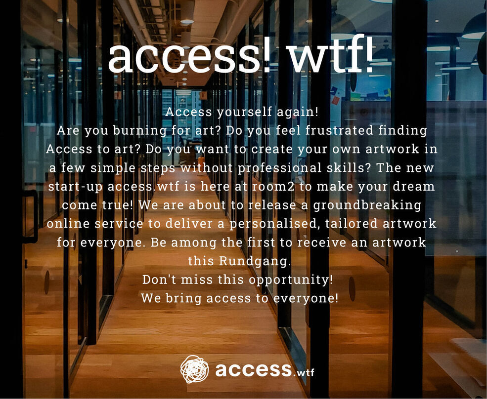 room2 ist Gastgeber für das Start-up access.wtf, das sich zum Ziel gesetzt hat, Menschen einen personalisierten Zugang zur Kunst zu eröffnen. Während des Rundgangs gibt es die exklusive Möglichkeit der Frühbucheranmeldung und einer Vorschau der Dienstleistungen. Das Start-up ist eine Ausgründung des ctrl-space-Seminars. Weitere Informationen unter https://access.wtf