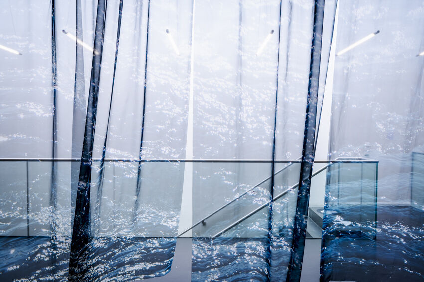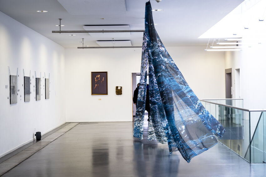 ![]() Soojin Ok, Das Meer schaukelt im Licht, 2022 Soundinstallation, Digitaldruck auf Chiffon-Stoff, 290 x 600 cm Foto: Dörthe Boxberg |