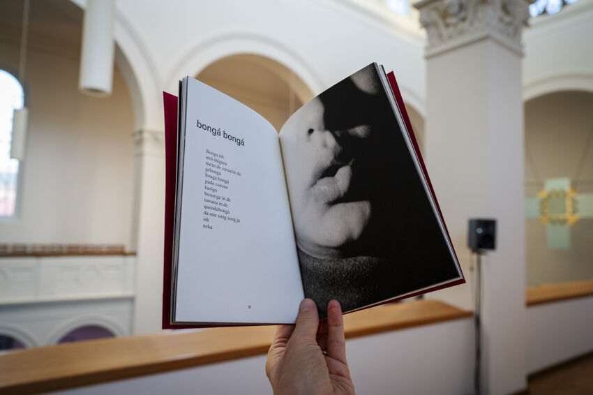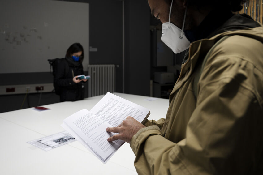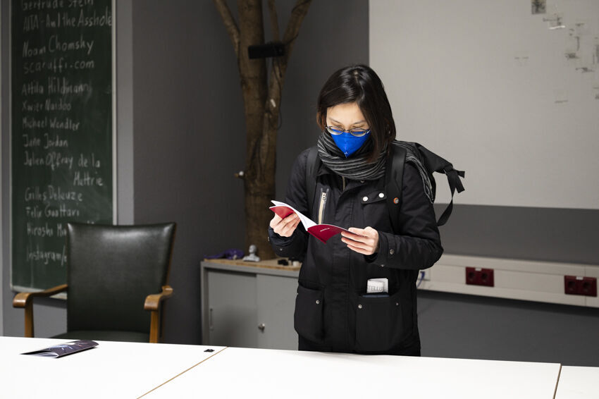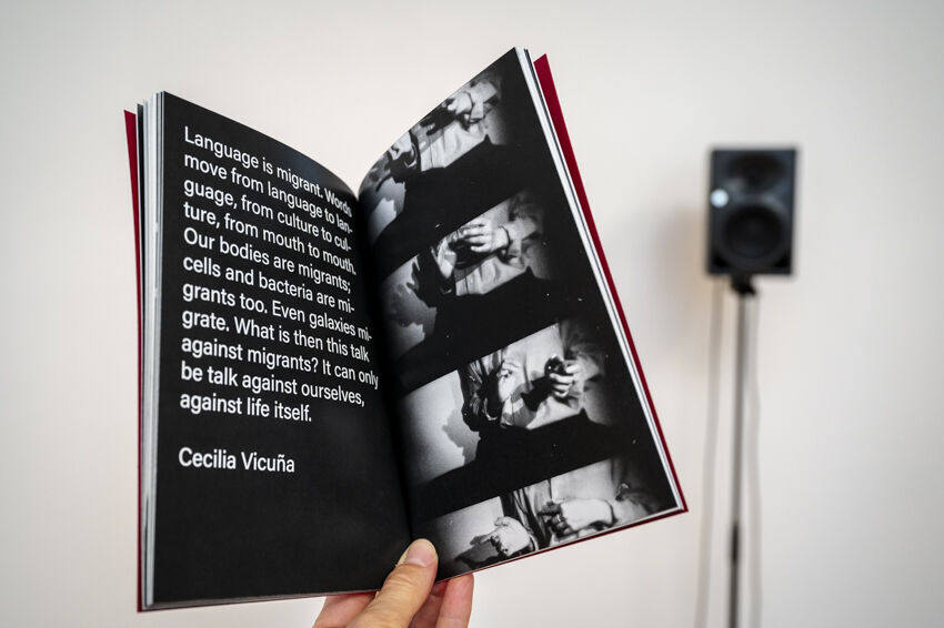 ![]() Kihuun Park / Ivonne Sheen Mogollón / Jazmin Rojas Forero / Pedro Ramírez / Jinhyun Kim, Kospalang: multilingual exercises between Korean and Latin American Spanish, 2022, 4-Kanal-Soundinstallation und Buch, 50 Min. Foto: Dörthe Boxberg |
