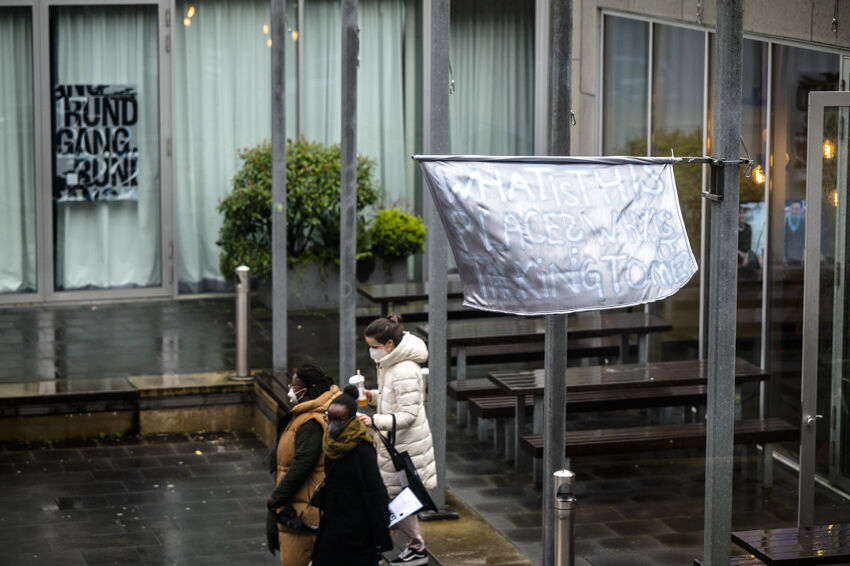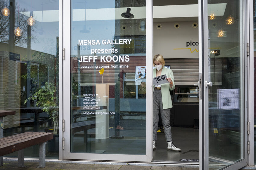 Die Mensa Gallery hat ihren Schlüssel zur Galerie wiedergefunden und präsentiert Jeff Koons; Dilara Raika Er installiert eine Flagge im Innenhof, Inna Lipovets verteilt Sticker an verschiedenen Orten.