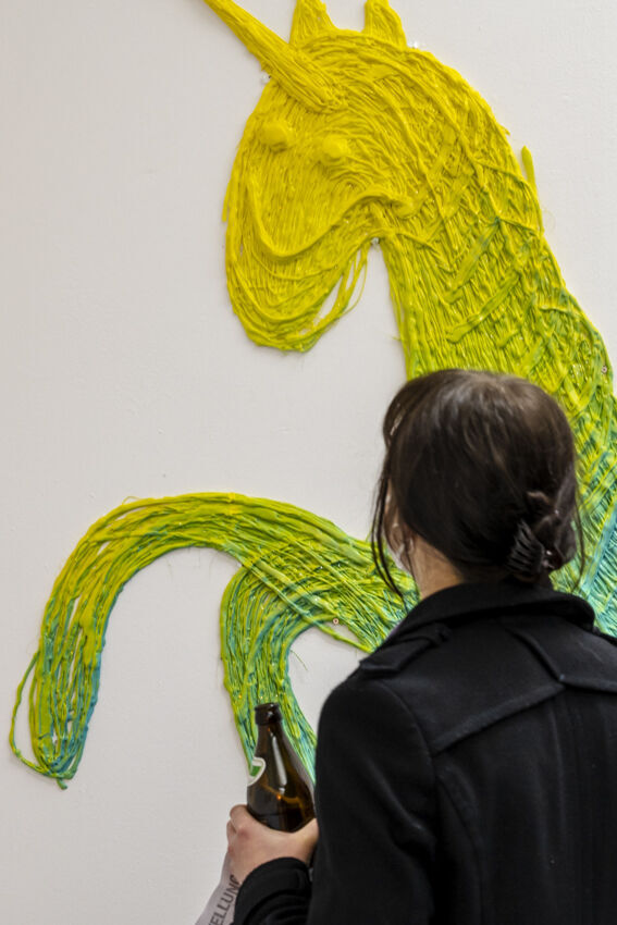 ![]() Sehyeong Lee, "Unicorn", 2022, Heißkleber, Sprühfarbe, Glitter, variable Größe (Detailansicht) Foto: Dörthe Boxberg |
