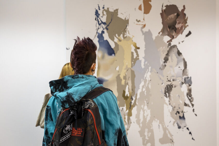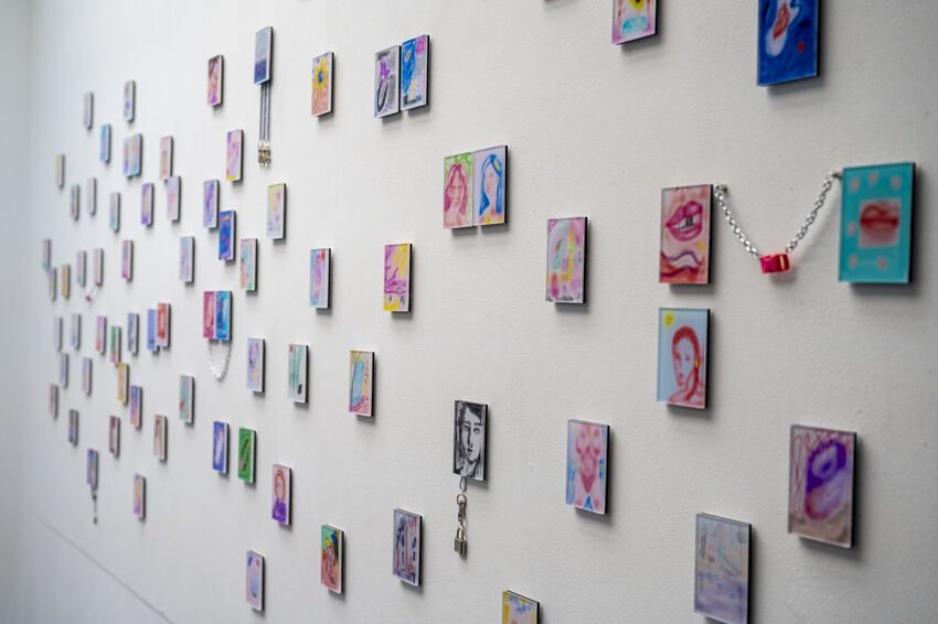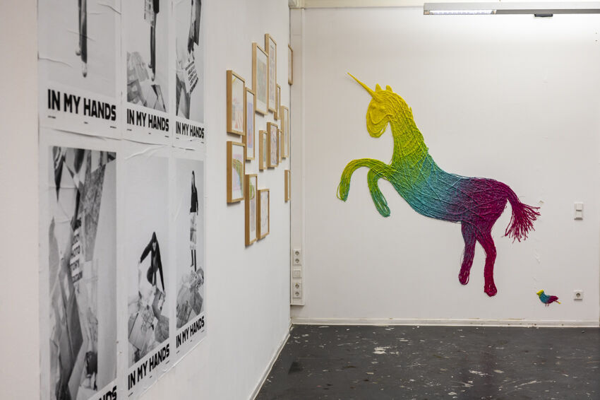 ![]() Links: Arbeiten von Leah Heeren & Drawing Group. Stirnwand: Sehyeong Lee, "Unicorn", 2022, Heißkleber, Sprühfarbe, Glitter, variable Größe Foto: Dörthe Boxberg |