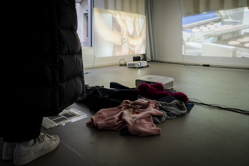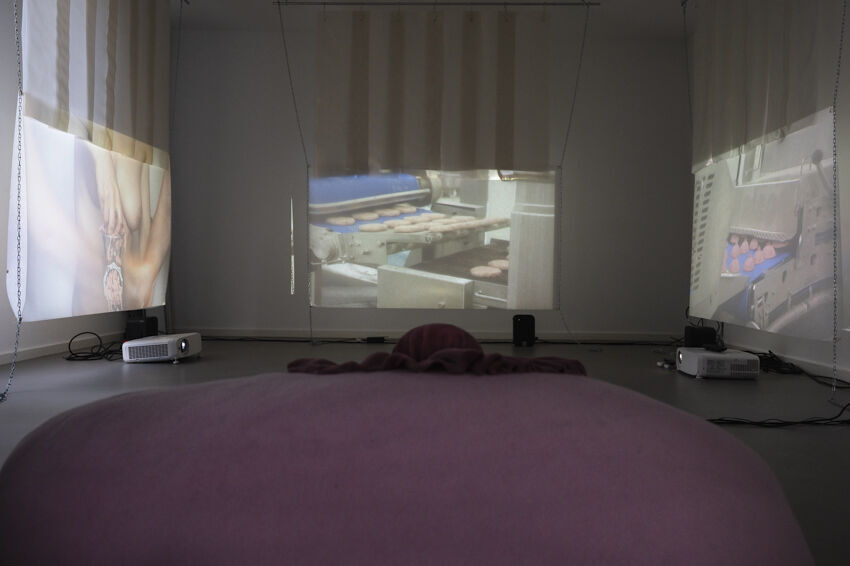 ![]() Jeanne van Eeden, Patties für den Spießburger, 2021 3-Kanal-Videoinstallation Foto: Dörthe Boxberg |