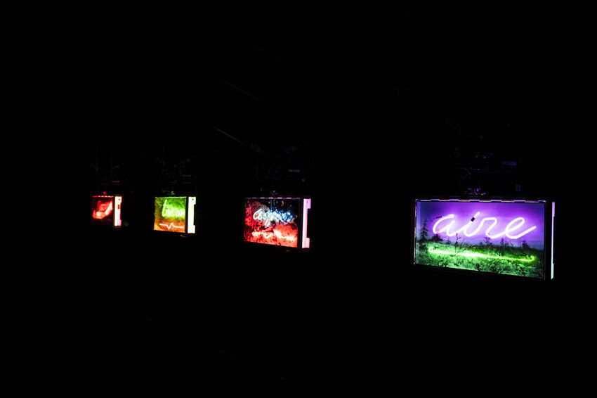 ![]() Friedrich Boell, C-D-M, 2019/2021, Videoarbeit auf vier mit Neonschrift modifizierten Flatscreens, je 40 x 50 cm 60 Min., Loop Foto: Dörthe Boxberg |
