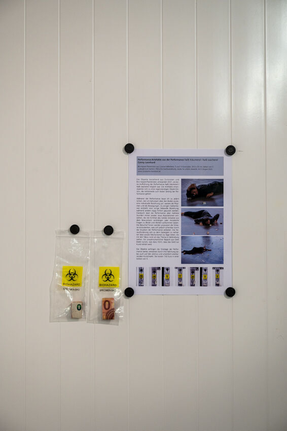 ![]() Constantin Leonhard, "Halb träumend / halb wachend", 2021, Performance-Objekte: Euro-Banknoten, in Biohazard-Plastikbeutel, gerahmt, je 20 x 14 cm Foto: Dörthe Boxberg |
