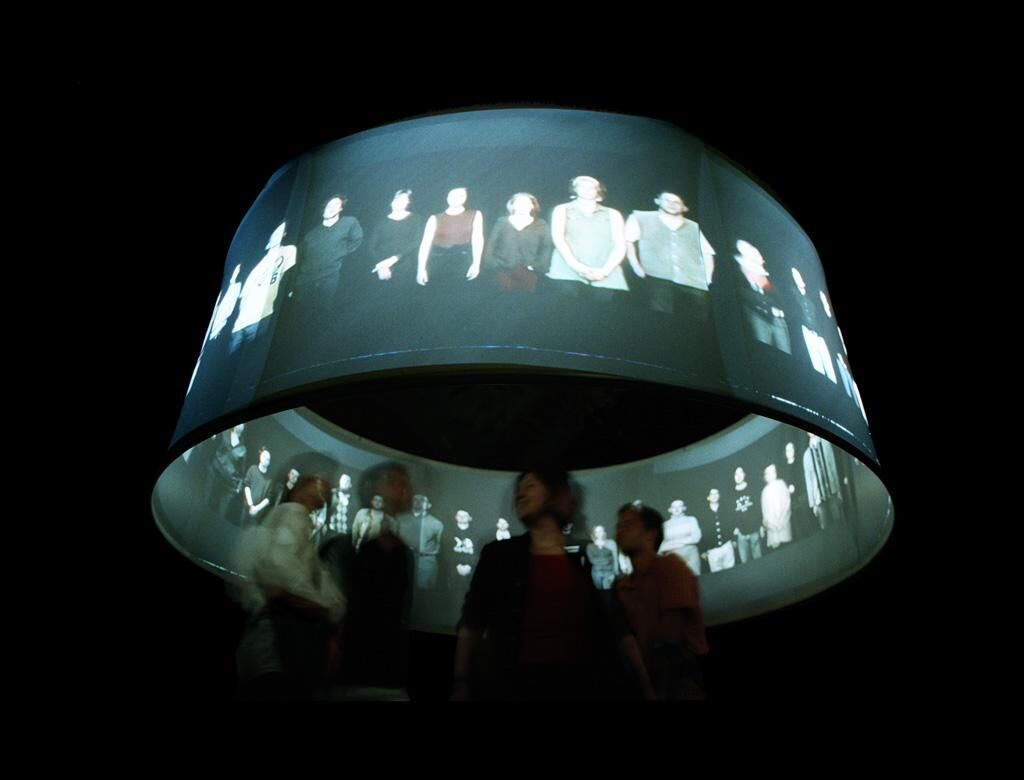 In einem dunklen Raum hängt in Kopfhöhe eine zylindrische Projektionsleinwand (Durchmesser 2,5m, Höhe 98 cm). Der Besucher tritt gebückt in die Mitte des Projektionskreises. Aus dem Nichts betreten ca. 50 Personen den Projektionsraum und umkreisen den Betrachter, sie stellen sich auf und begegnen direkt seinem Blick. Der Besucher übernimmt die Rolle des Schauspieler. Der Betrachter wird betrachtet. Das virtuelle Publikum beginnt zu rotieren, anfangs langsam wie im Tanz, dann mit zunehmendem Tempo. Der Betrachter wird vom Schwindel erfaßt und verließt das Raumgefühl, bis alles wieder zum Stillstand kommt, um wieder von vorne zu beginnen. Ein Kreislauf.