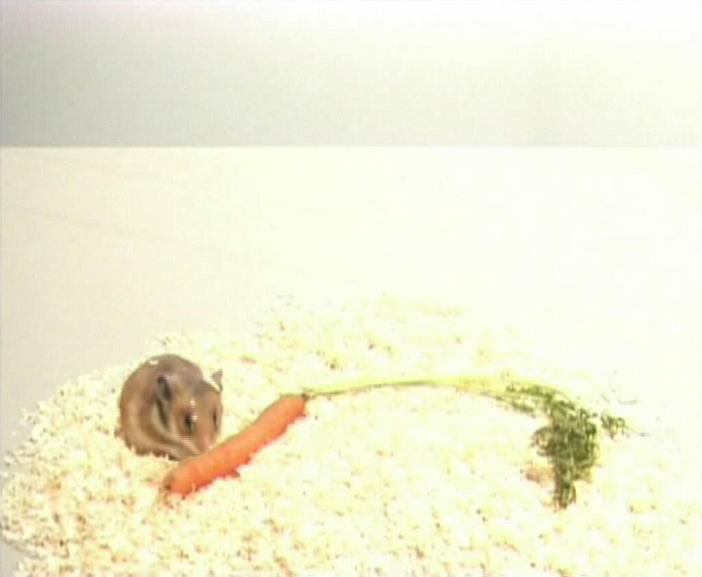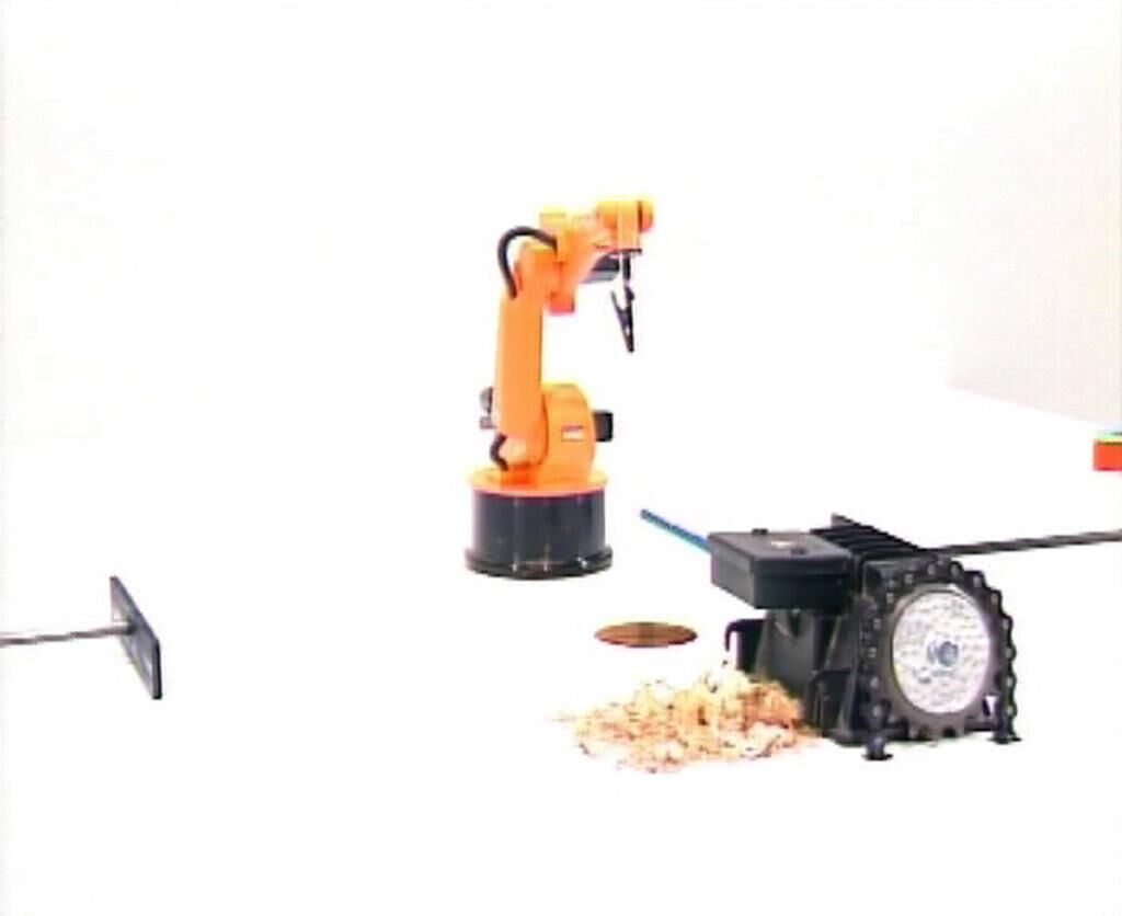 Darsteller: Ein Industrieroboter ""Model Kuka Standard"" und ein Goldhamster (Mesocricetus auratus)