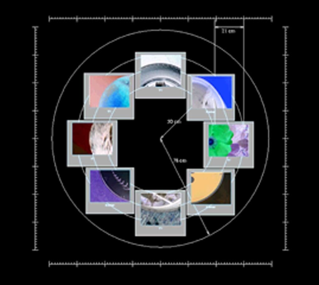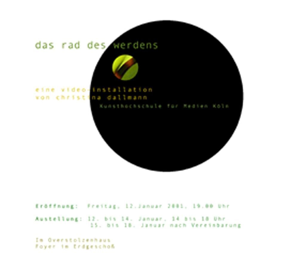 Die Video-Installation besteht aus acht Monitoren, die in Kreisform aufgestellt werden. Acht DVD-Player dienen als Zuspieler. Eine Drehscheibe mit dem Durchmesser von 160 cm und einem runden Loch (oder zwei Löchern) wird vor den Monitoren angebracht. An ihr ist ein Motor befestigt, der mit einem Bewegungsmelder verbunden ist. Sobald der Zuschauer auf die Installation zugeht, beginnt die Scheibe zu rotieren und die DVDs starten. Auf den Monitoren sind Ausschnitte runder Gegenstände zu sehen. Jeder Monitor zeigt Bilder aus einem bestimmten Bereich, wie beispielsweise Architektur, Spiel, Unterhaltung, Natur etc.. Die Ausschnitte ergeben zusammen und durch die Bewegung der Drehscheibe einen in sich geschlossenen Kreis. Das Rad des Werdens zeigt den ewigen Kreislauf des Daseins, nichts ist von Dauer, die Dinge fließen ineinander, nur die äußere Form bleibt beständig.