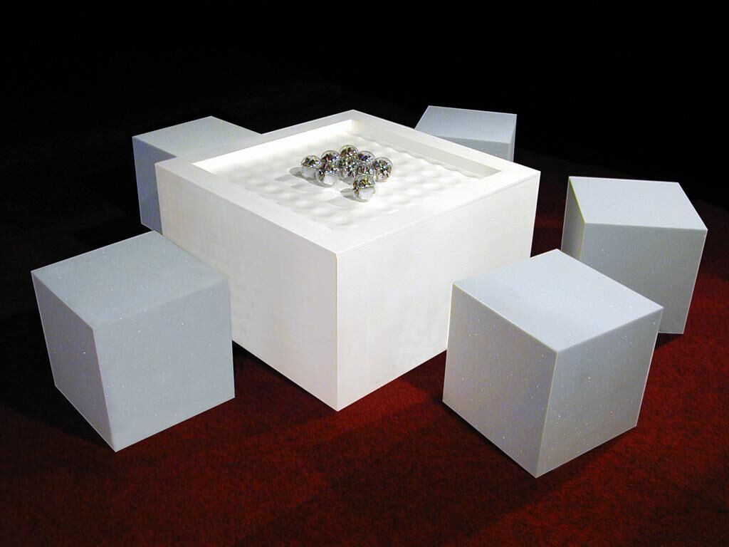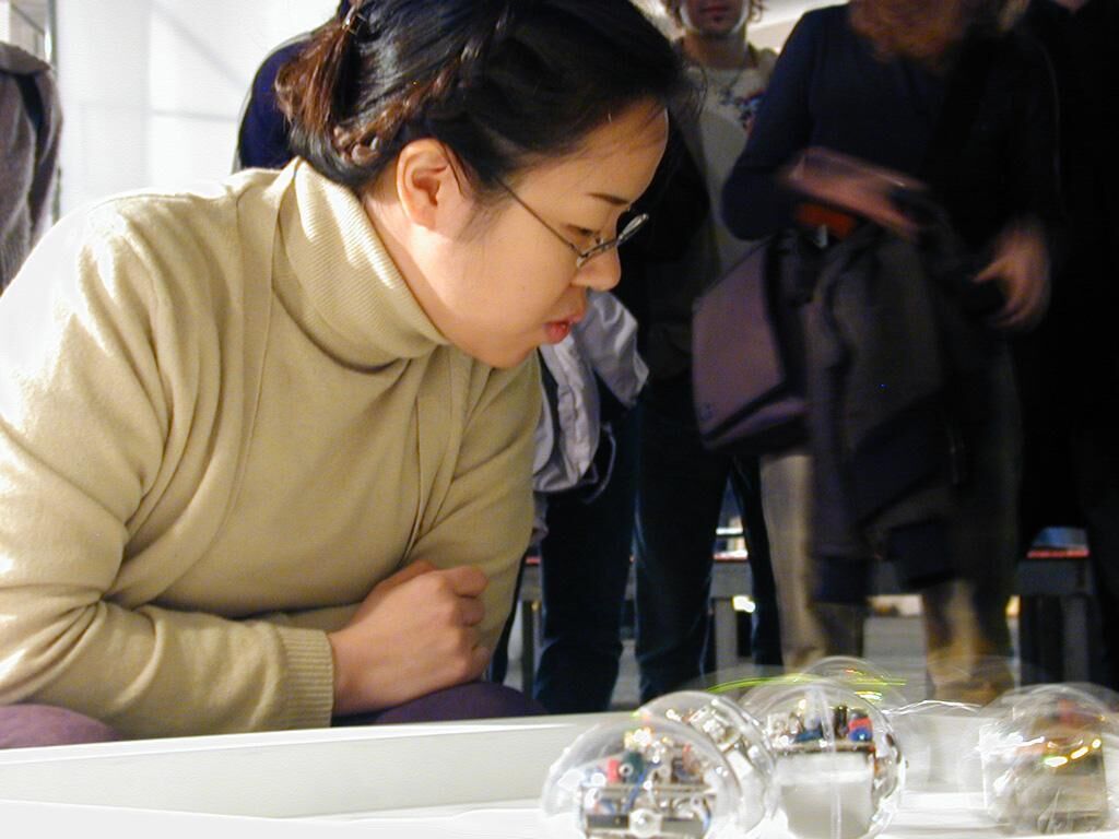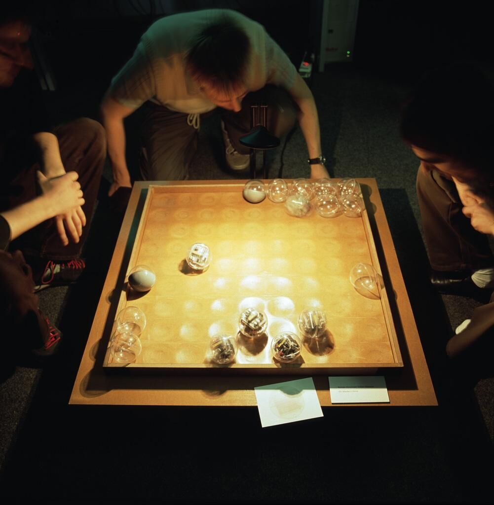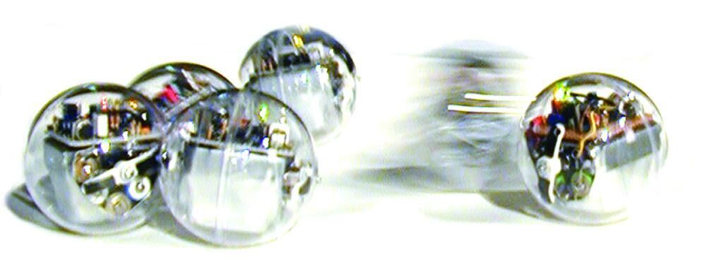 /fur// (Roman Kirschner, Volker Morawe, Tilman Reif) His Master‘s Voice is a robotic board game. The players can move semi-autonomous ball robots by making sounds. Form and gravity collude with voice, board and chance. Each ball listens to a certain pitch and starts to move if the right frequency was hummed or sung. The initial setting does not provide rules.
