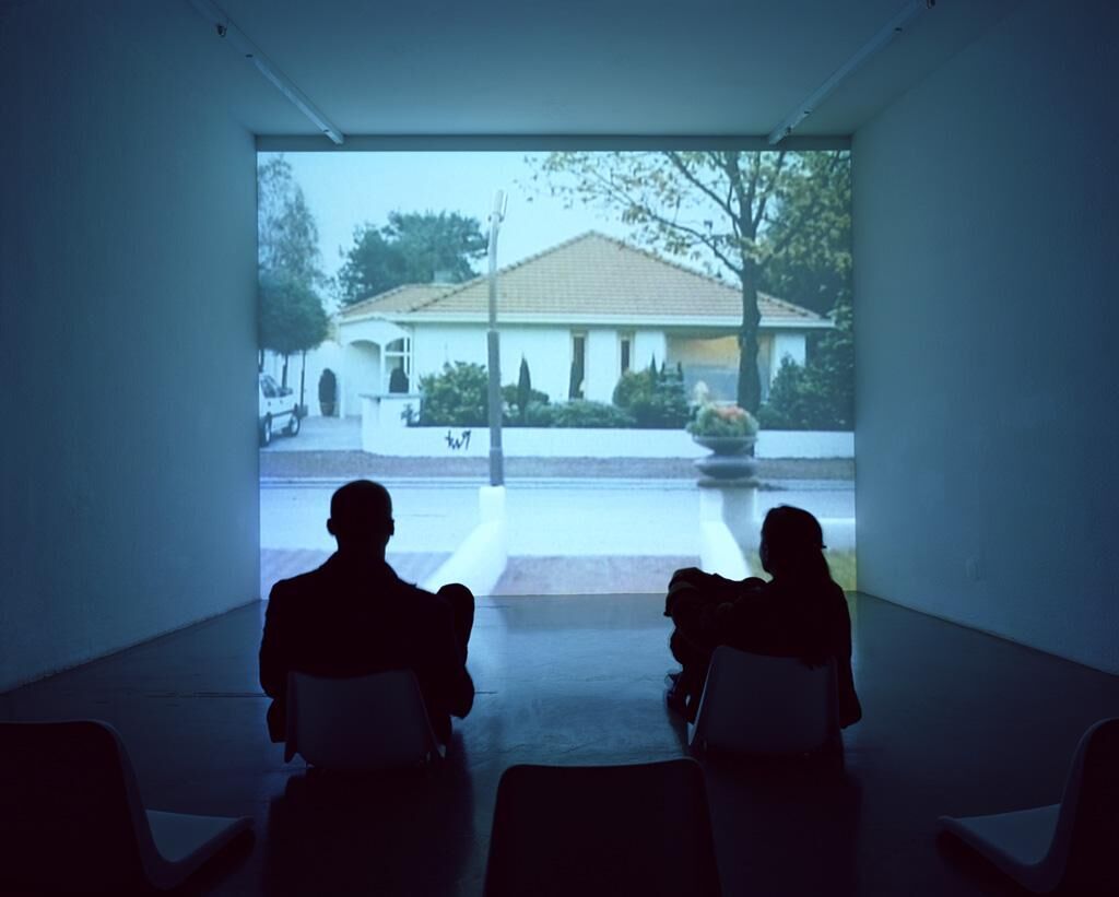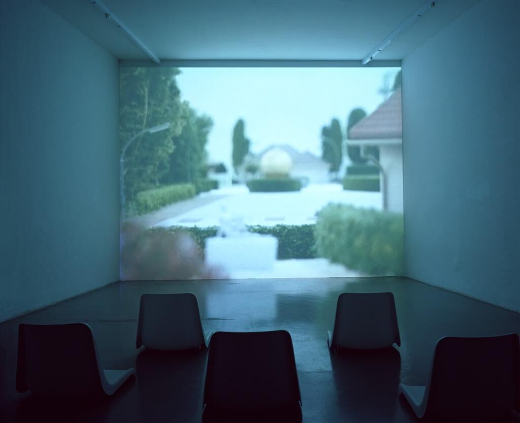 The cultivated idyll of sophisticated residencies pass by in peaceful regularity. Fastidiously tended front gardens, and the characteristic facades and trees of well to do establishments, assume park-like grounds behind the villas. A collage of reduced environmental sounds, synthetic tacts, and interlaced fragments of melodies, accompan the journey through this world that seems to get increasingly artificial. Paralysis envelops this place - a small dog acts as if he is numbed, the jet of a fountain seems to be frozen. The noise of a ringing telephone hints at the existance of inhabitants, in fact, all signs of existence in the work are implied through references. Differing layers of reality – part recordings of models, part photographs of actual settings – have been fused into a single image, into a synthetic idyll. The effect is unsettling – on the one hand, like the hostile entity of the idyll itself, and on the other hand, like the increasing perfection with which the synthetic and the real merge. (Michael Voets)