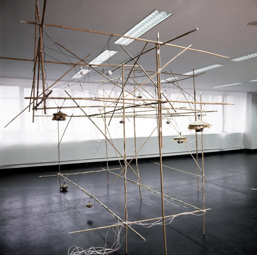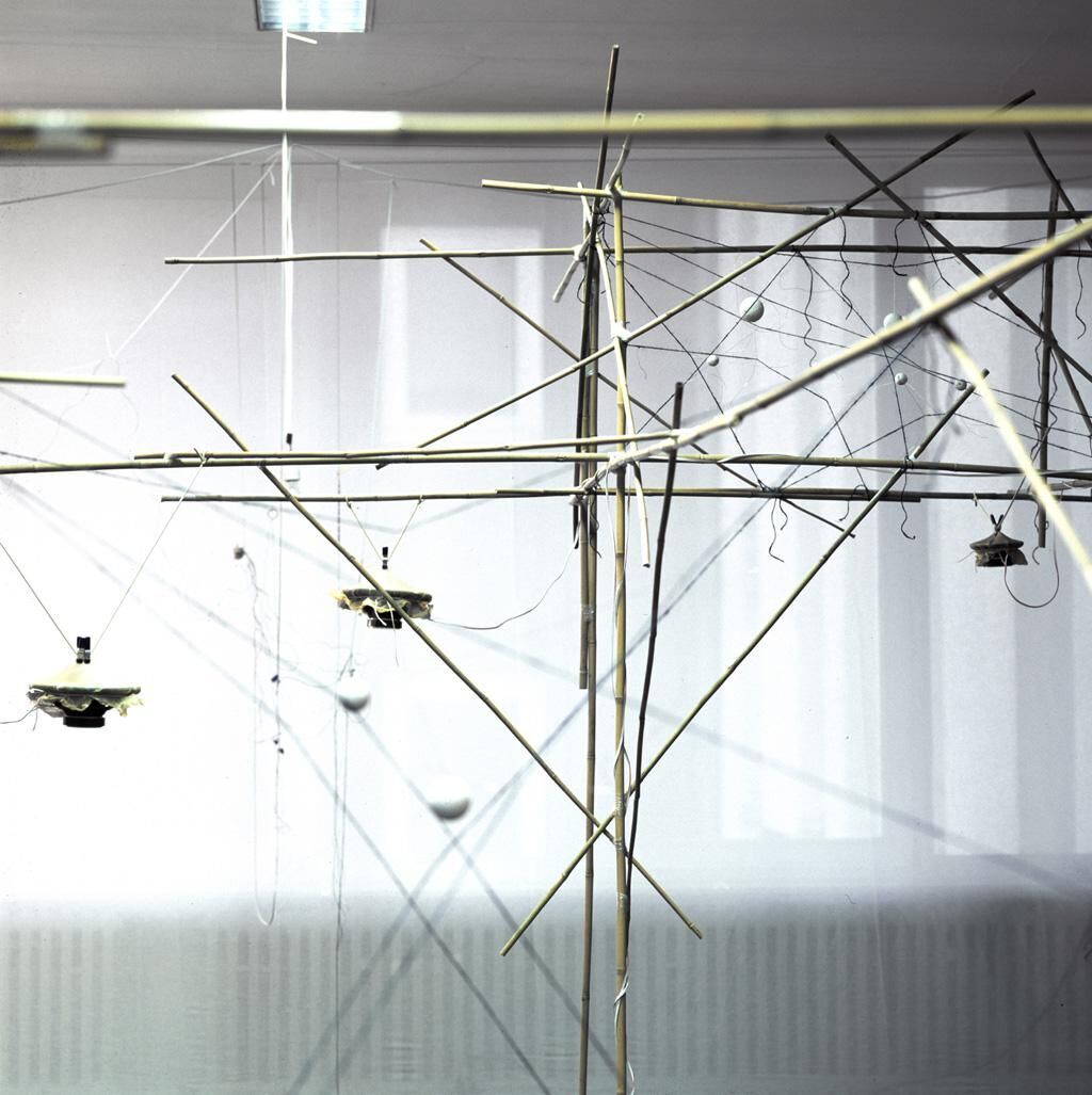 Das funktionale Modell repräsentiert eine flüchtige, in sich verharrende Anschauung. Es besteht aus einem würfelförmigen Bambusrahmen, in dessen Inneren Kugeln mit Fäden und Drähten aufgespannt sind. Die Konstruktion erscheint zunächst chaotisch, läßt dennoch Strukturen erkennen und nachvollziehen. Angekoppelte Lautsprecher übertragen mechanische Bewegungen auf das Modell und regen das System an. Diese Zuckungen sind unterschiedlich stark ausgeprägt und meist nur visuell wahrnehmbar. Die Übergänge dieser resonanten Zustände entsprechen der Basis einer analogen Sprache. Im koordinierten Spiel der Anregungen entstehen Vorstellungen, die Gedanken dinghaft werden lassen.