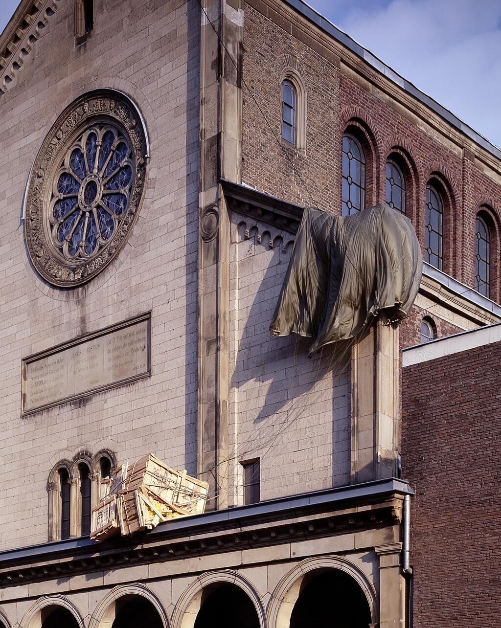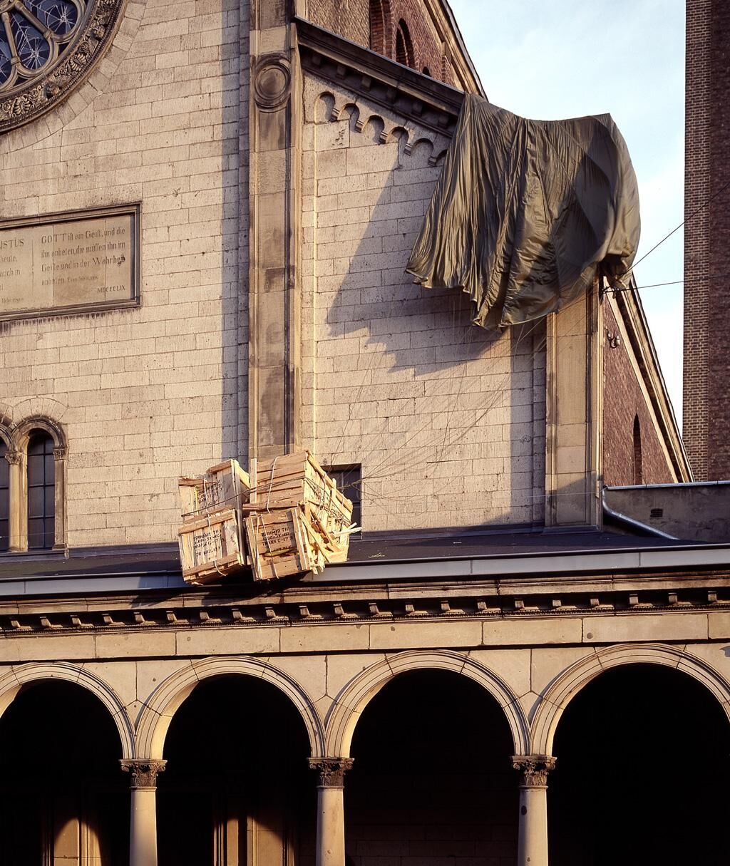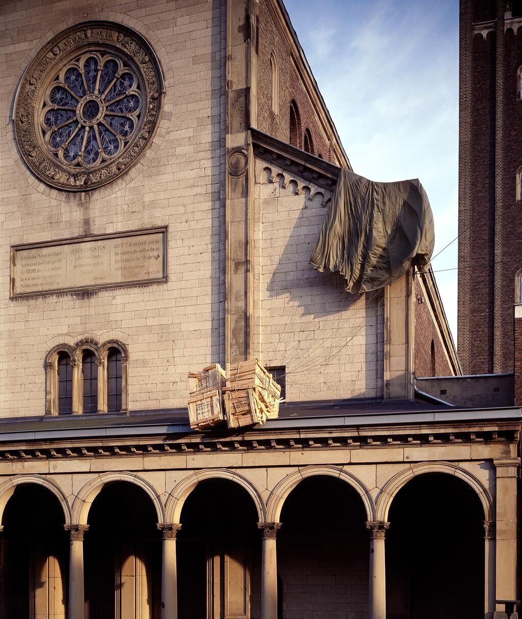 Erscheinung, Fassade der Messehalle, 2002. Holzkisten, Lastenfallschirm. Während des Afghanistan Vergeltungsfeldzugs „gerechter Krieg“ hat die USA die Doppelstrategie „Brot und Bomben“ angewandt. Mit Frachtflugzeugen wurden „Airdropings“ durchgeführt, d.h. im zentralen Hochland und an der südlichen Grenze zu Pakistan sind ca. 70 000 Tagesrationen abgeworfen worden. Ein „Airdrop“ besteht aus mehreren zusammengeschnürten Kisten, die leuchtend gelbe Pakete mit Linsen, Bohnen, Fett, garniert mit Knoblauch und Gewürzen wie Kreuzkümmel und scharfem Pfeffer beinhalten. Eine Tagesration enthält 2300 Kalorien und ist mit dem Text beschriftet: „Dies ist ein Nahrungsgeschenk des amerikanischen Volkes“. In Englisch, Spanisch und Französisch. Die Arbeit reflektiert eine aktuelle künstlerische und politische Identität, wo Wahrheit lediglich eine institutionelle, programmatische Strategie, eine Ressource, ist und verdeutlicht die momentane Hilflosigkeit der Kunst.
