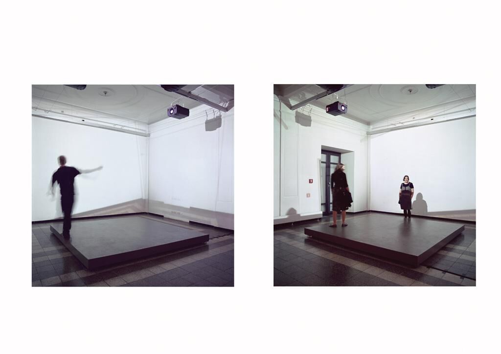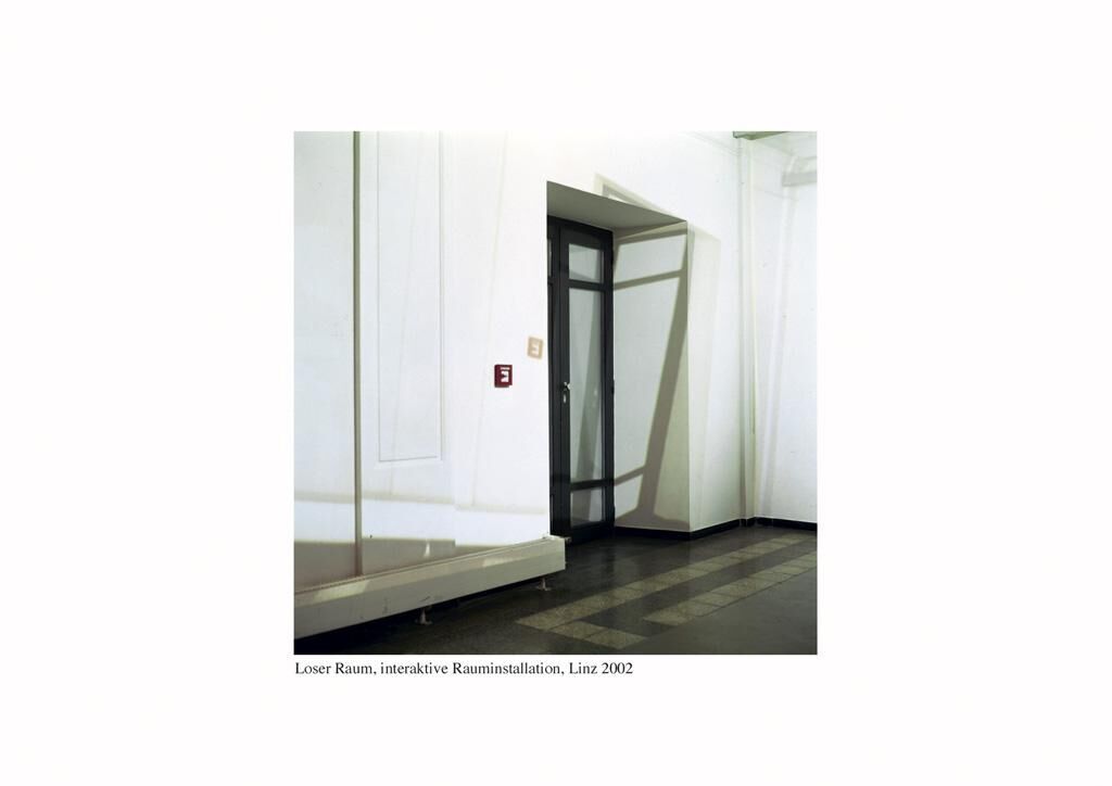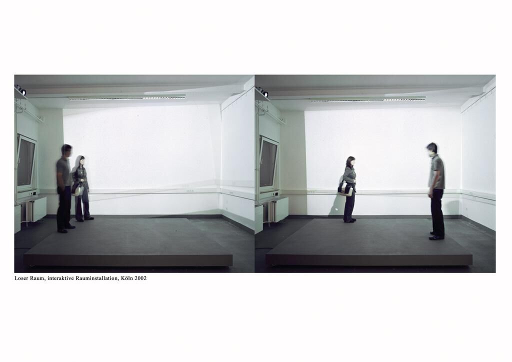 „Loser Raum“ ist eine künstlerische Auseinandersetzung mit Raumwahrnehmung, handelt von Orientierung und Gleichgewicht in einer Installation, die als ""Augmented Reality"" zu bezeichnen ist. In eleganter und natürlicher Weise wird Alltagsrealität mit Virtualität im wahrsten Sinne des Wortes zur Deckung gebracht. ""Loser Raum"" ist eine ""Tageslicht""-Cave, die in ihrer spröden Ästhetik an die Minimal Art anknüpft, die sie um die Errungenschaften des Technologie-Zeitalters erweitert. Die Arbeit ist eine grundsätzliche und präzise Auseinandersetzung mit den Themen Interaktion und Virtualität. Es ist ein flexibles System entwickelt worden, das sich physischen und räumlichen Gegebenheiten anpasst und sie gleichzeitig um sich selbst erweitert. Trotz hochkomplexer Technik bleibt ""Loser Raum"" konkret und reduziert. Die Elemente der künstlerischen Umsetzung werden minimiert auf eine einfache und deutliche Aussage, die ihre Differenzierung in ihrer präzisen Umsetzung aufweist (Dämpfungsalgorithmen, Trägheitssimulation). Ihre vordergründige Einfachheit bringt die Arbeit fast zum Verschwinden. Doch durch die selbstverständliche Interaktion entfaltet das visuelle und physische Erleben von ""Loser Raum"" seine ganze Poesie. (www.netzspannung.org"")