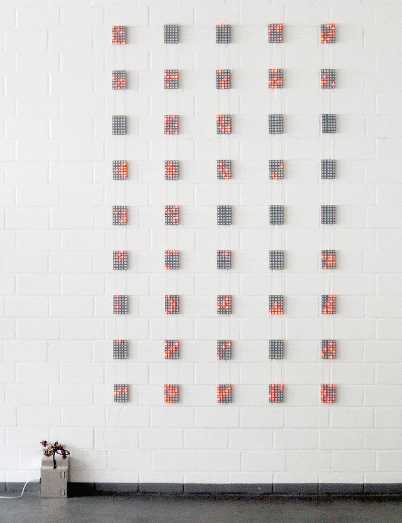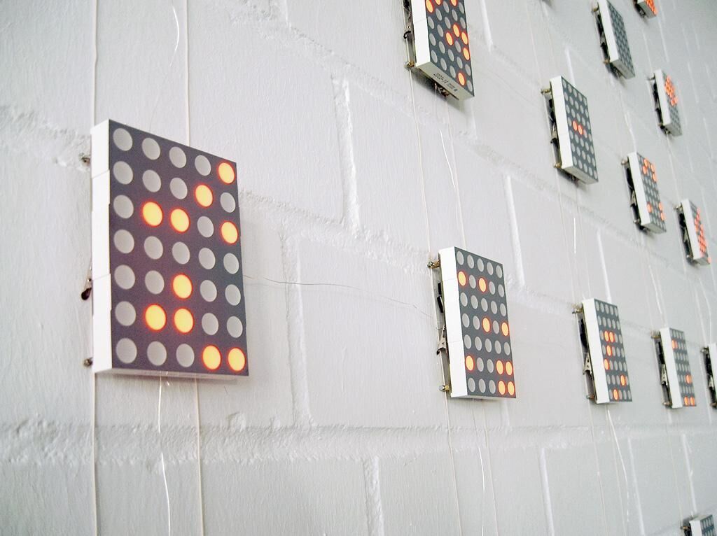 Hinter den Dot-Matrix-Bauteilen ist jeweils eine Platine mit einem Mikroprozessor montiert, die über zwei Lackdrähte mit Strom versorgt werden. Ein weiterer Draht dient der Vernetzung der einzelnen Displays. Im Gegensatz zu den meisten Versuchsanordnungen, die erforschen, welche Strukturen sich aus der Definition von nachbarschaftlichen Verhältnissen ergeben (zelluläre Automaten), wird in der Wandinstallation „Display“ eine Modularität nicht simuliert. Jedes Display funktioniert tatsächlich autonom und zwischen benachbarten Displays werden tatsächlich Impulse ausgetauscht.