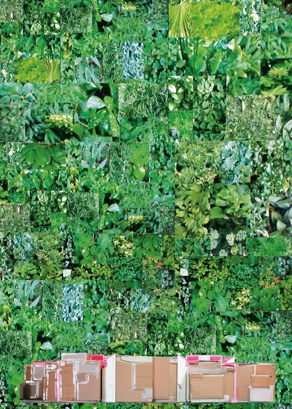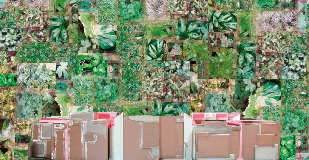 Plastikpuppenhäuser mit Pappe vor Fotocollage