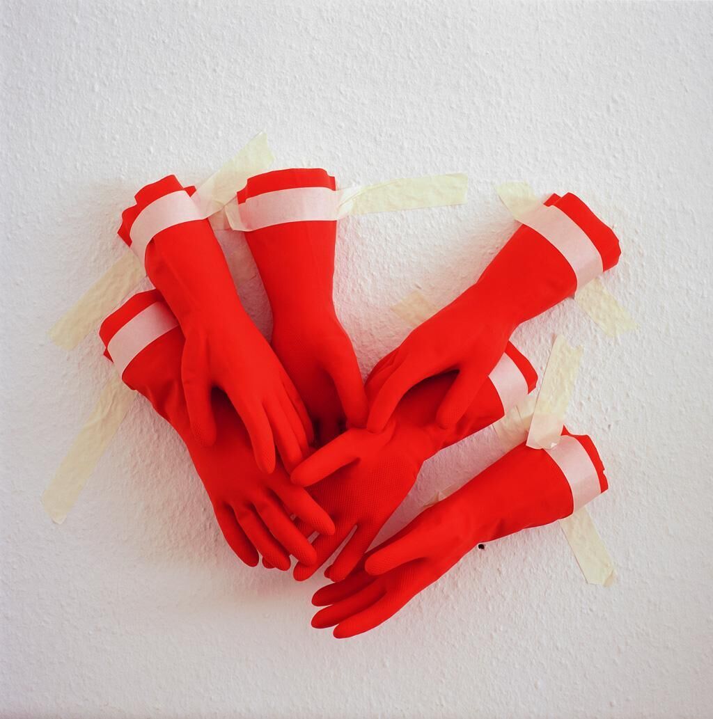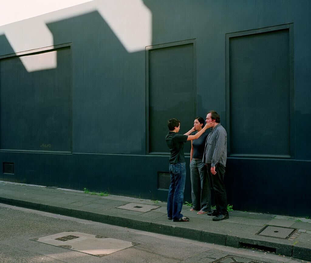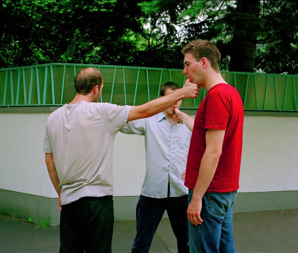 Drei Menschen stehen auf der Straße beisammen. Sie scheinen sich zufällig dort getroffen zu haben. Die Sonne scheint vorsichtig über die gegenüberliegende Häuserfront, deren Schatten sich schwer aber nicht kalt über die Szene legt. Vielleicht unterhalten sich die jungen Leute über das Wetter. Doch können zwei von ihnen offensichtlich gar nicht sprechen, da sie die Daumen des Dritten im Bunde im Munde haben. Es findet eine Kommunikation der anderen Art statt. Tatsächlich scheint das Triumvirat in seinem Tun sehr konzentriert, angespannt oder sogar paralysiert zu sein, ohne den Betrachter als Beobachter zu bemerken. Solche(s) und jenes trägt sich in der gleichnamigen Fotoarbeit von Tamara Lorenz so leichtsinnig zu, als wäre es zufällig im Alltag beobachtet. Doch die ritualisierten, leicht aus der gewohnten Ordnung verrückten Handlungen und nicht zuletzt der klar komponierte Aufbau der Bilder entlarvt sie eindeutig als Inszenierungen; aufgeführt auf der Bühne des Lebens. Es entsteht eine eigenartige Symbiose aus Schnappschuss-Charakter und streng konzipierter Anmutung. (…) Doch in all den kleinen „Handlungsstücken“ der Künstlerin versteht sich gar nichts von selbst, sondern entsteht allenfalls wie von selbst, ohne Sinn und Zweck. Amüsiert und zugleich beunruhigt bleibt der Betrachter mit seinen üblichen Bedeutungsverdacht alleine, wie ein Kind das gerne dazugehören möchte, aber glaubt, die Spielregeln noch nicht verstanden zu haben. Die oft negierte Sinnfrage des Lebens wird in den Fotografien von Tamara Lorenz sozusagen umgekehrt, indem nicht die Sinnlosigkeit jeglichen Tuns vorgeführt wird, sondern die scheinbare Sinnhaftigkeit des absurden, intuitiven anderen Handelns zum Durchbrechen von verfestigten Konventionen einlädt. Eine Einladung zum Wieder-Mehr-Kind-Sein. (Ulrich Leschep) (dazu gehört auch die Photoreihe “Reflexible Rumpfbeugung” 8 Lambdaprints, 26,5 x 31 cm, Holzrahmen)