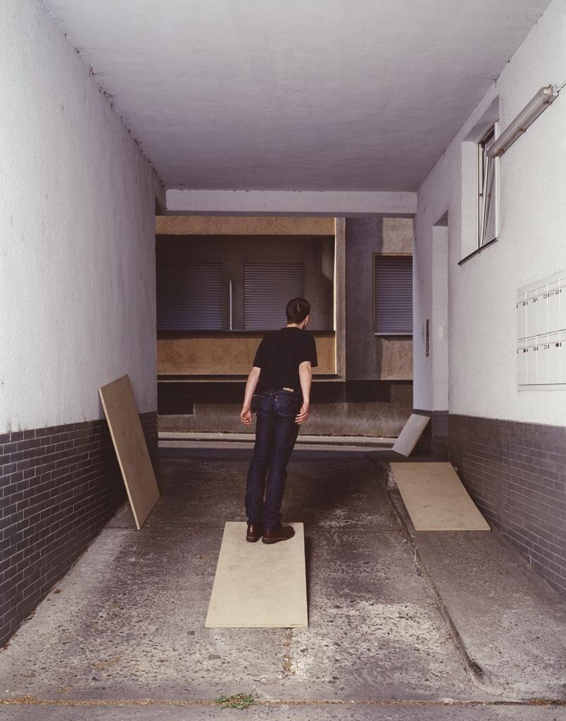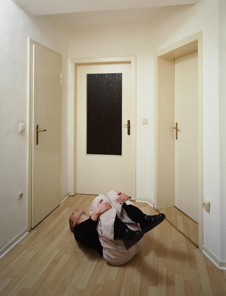 Bei ‘Umposen’ inszenierte ich Personen in Räumen, zu denen sie in ungewöhnlichen körperlichem Ausdruck nehmen. Die Arbeit umfaßt sechs Bilder, in dem je ein Protagonist in der Rolle des Einzelgängers, des Einzelkämpfers agiert. Man findet Kinder im Spiel außer sich, aber erwachsene Menschen treten seltenst aus ihrer konventionellen Form. Die Haltung zu bewahren im sprichwörtlichen Sinne, bezieht sich auch auf die körperliche Kondition, so wird die Haltung für einen kurzen Moment verloren, wenn man plötzlich und unerwartend stolpert, aus seiner Form fällt und sich über das seltsame Gefühl während dessen und kurz danach wundert. Diese Arbeit leitete mich zu ‘solche und jenes’, ein anderes Verhalten, eine andere als die gewohnte körperliche Haltung einzunehmen, die sich auf den Raum bezieht. In meiner Diplomarbeit ist die Handlung nun wichtiger als der Raum, der Raum bietet die Variante, aber ist austauschbare Kosmetik.