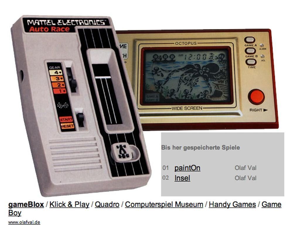 Die „paintOn Games“ lassen sich direkt bemalen und auf Styroporplatten kommt es zu neuen Spielentwürfen, die jedoch nicht unmittelbar gespielt werden können, da hierzu erst jeweils eine Platine mit entsprechender Software entwickelt werden müßte. Die Internetseite „GameBlox“ macht es möglich ganz einfach Spiele zu entwerfen und auch gleich zu spielen. In Anlehnung an die „paintOn Games“ wird das Spielfeld aus Würfelförmigen Elementen, den „GameBlox“, zusammengesetzt. Auch das Spielprinzip ist identisch, es geht darum mit der kreisförmigen Spielfigur herabfallenden Ringen auszuweichen. Diese Spielsymbole können auf einer Matrix von 6 x 6 Pixeln selbst gestaltet werden. Ist ein Spiel fertig zusammengebaut, kann es mit Name und Titel auf dem Server gespeichert werden und ist auf dies Weise im Internet veröffentlicht.