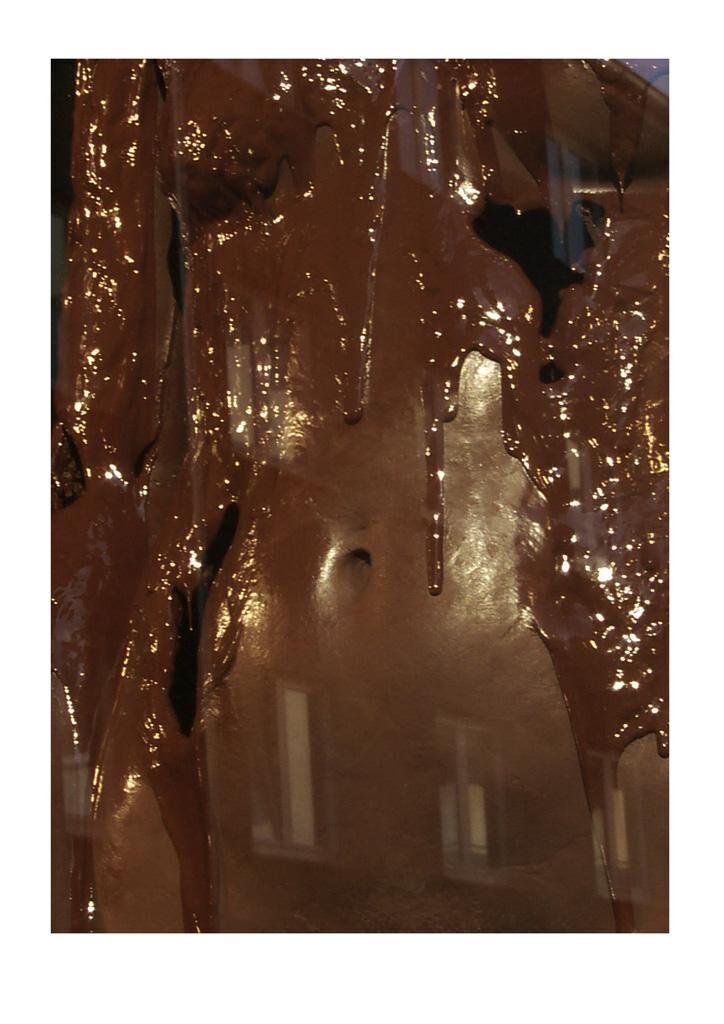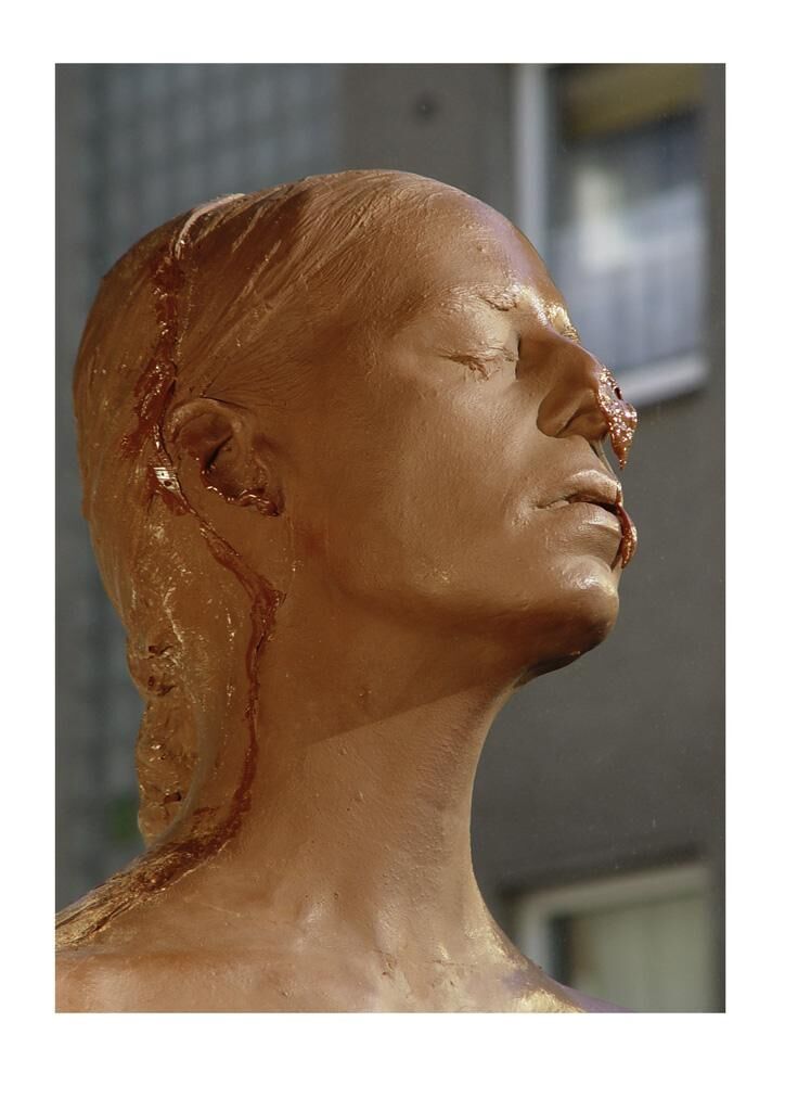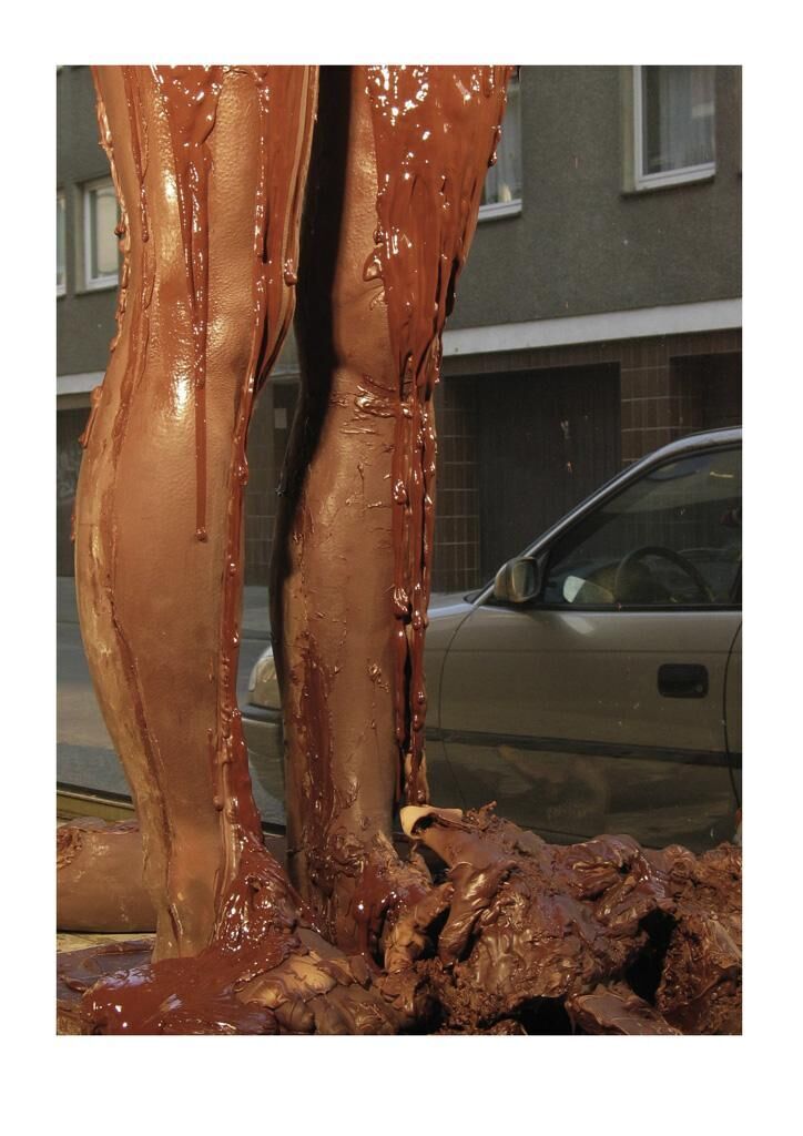 In the video documentary, the artist lets a whole body impression of herself, which is made of chocolate, melt completely away under a heater.