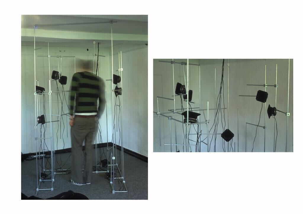 Der ""Baukasten für bewegliche Orte"" ist ein System für eine flexible, mit den Gegebenheiten korrelierende Skulptur aus verzinkten Stahlwürfeln, -winkeln und -stäben. Die Bauelemente können in alle Richtungen aneinander gesetzt werden. Sie teilen den Raum, werden in Bezug gesetzt zum Neben, Über, Unter oder Dazwischen. Der Baukasten ermöglicht die Herstellung einfacher Orte, z.B. einer Wand, eines Zwischenraumes oder Durchgangs. Er bleibt unvollständig. In jeden Aufbau werden fremde Elemente integriert; in Gütersloh sind es Tonaufnahmen, die während des Transportes in einem Kastenwagen aufgenommen wurden. In Form kleiner Lautsprecher sind die verschiedenen Klangmischungen aus den Eigenfrequenzen des Materials und Fahrtgeräuschen in der Konstruktion präsent. Der Baukasten berichtet von der eigenen Unstetigkeit.