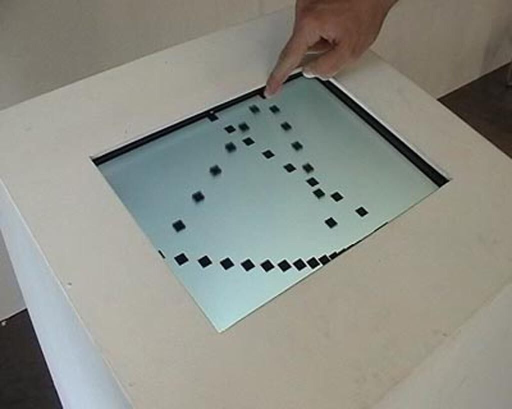 Auf dem Touchscreen eines Terminals ist eine Linie aus groben schwarzen Rechtecken vor weißem Hintergrund zu sehen. Der Besucher kann sie – einem Gummiband ähnlich – mit dem Finger in verschiedene Richtungen ziehen. Zieht er sie bis zum Bildschirmrand, wird die Linie dort verankert; er kann sie so in unterschiedlichen Formen über den Bildschirm spannen. Nach kurzer Zeit löst sie sich wieder und schwingt nachfedernd in ihre Ausgangslage zurück. Dies geschieht ebenso, wenn zuviel Spannung auf die Linie ausgeübt wird. Ihre Materialität wird allein durch die Bewegung und Abhängigkeit der Elemente untereinander vermittelt. Es wird auf hohem visuellem Abstraktionsgrad ein dem Besucher vertrautes physikalisches System simuliert, dessen Zusammenhänge er spielerisch erforschen kann.