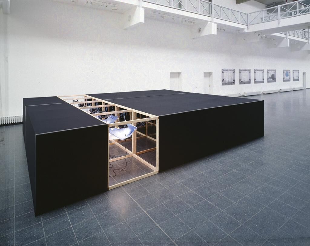Ohne Titel, Skulptur, 2004, Holz, Stoff, Lampen u.a., 110 x 600 x 500 cm. Ausstellung im Neuen Kunstforum Köln, 2004 (zusammen mit Charlotte Desaga).