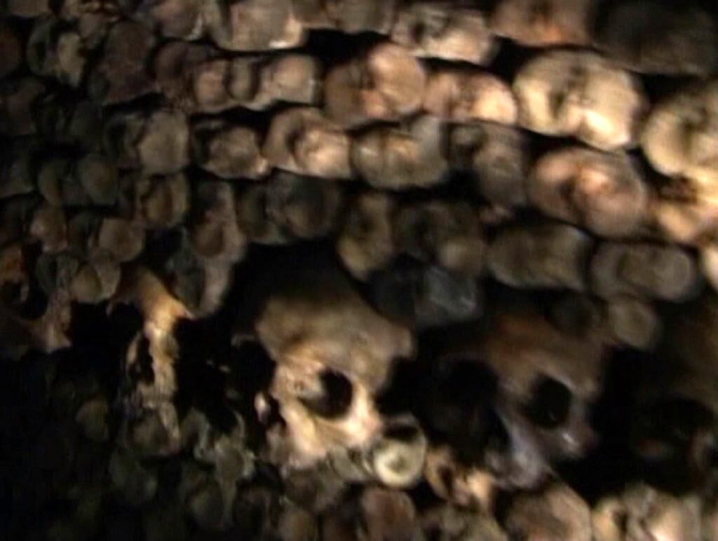 Ein geschlossener, hoher, dunkler Raum. Auf dem Boden liegt eine begehbare, 2,60 m x 2 m große Spiegelfläche. Das Videobild wird senkrecht nach oben auf die Projektionsleinwand geworfen, die waagerecht unter der Decke hängt. Der Besucher muss die Spiegelfläche betreten, um sich selbst in und zwischen den Bildern zu erfahren. Der Betrachter sieht schwankende Bilder, einen Gang durch die Dunkelheit der Katakomben von Paris. Ab und zu erkennt man sich bewegende Lichter, Lampen oder Knochen. Dazwischen sind immer wieder völlig schwarze Sequenzen. Nur am Ende gibt es eine verschwommene, helle Sequenz. Der Gesang ist dominant, dringt laut und choral aus allen Ecken.