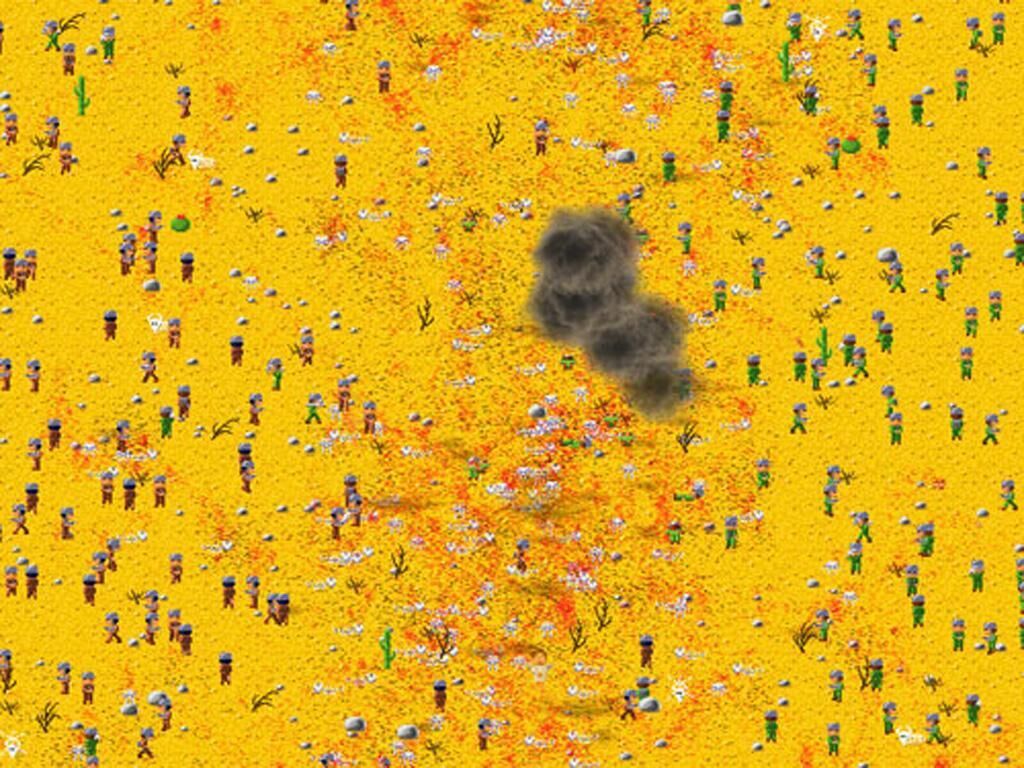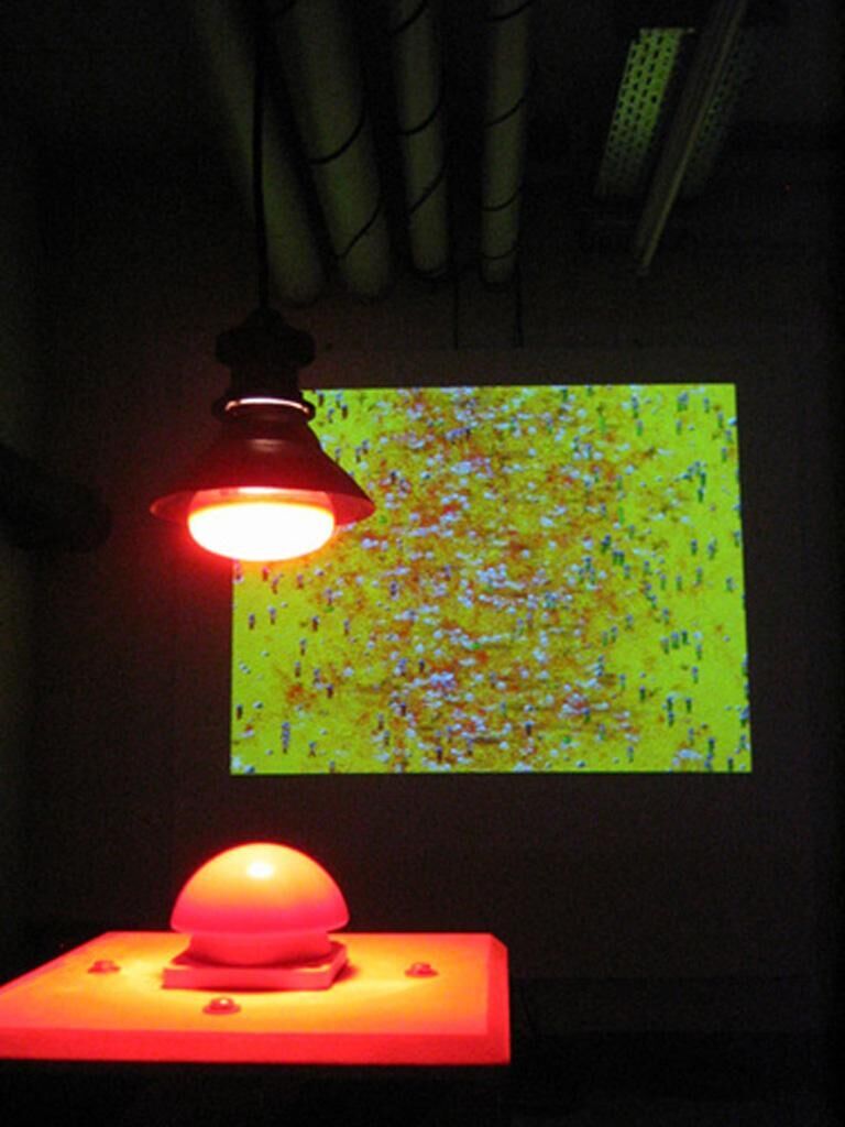 ""Wargame"" referenziert die Ästhetik der Computerspiele der ausgehenden 80er Jahre, in denen sich - gestützt durch den Siegeszug des Mediums VHS - der stilisierte Krieg zu einem besonders beliebten Setting entwickelte. Angesichts der realen politischen Ereignisse jener Zeit wie Friedensbewegung und Perestroika bedienten diese Stilisierungen ein zutiefst reaktionäres Weltbild, das sich nicht zuletzt aus dem Festhalten am Kalten Krieg und einer Heldenglorifizierung als Heilmittel des Vietnamtraumas speiste.   Jenseits dieses politischen Kontextes aber stellten die Action-Kriegsspiele nichtsdestotrotz ein erfolgreiches und unterhaltsames Spielprinzip dar - ein Problem für Spieler und Spieleentwickler, die sich durch diese Spiele perfekt unterhalten sahen, politisch aber mitunter gänzlich andere Standpunkte einnahmen.  Die Firma Sensible Software trieb diesen Konflikt zwischen Spielspaß und Spielsemantik mit ihrem sarkastischen ""Cannon Fodder"" (Virgin Interactive 1993) auf die Spitze und die inhaltliche Ebene ad absurdum (Textauszug aus dem Titelsong: „War has never been so much fun! Go to your buddy, kill him with your gun, make him die in his uniform, die in the sun!“) und stellte so die Differenz der Ebenen auf frappierende Weise bloß.  „Wargame“ greift diesen Ansatz auf und führt ihn weiter, indem es auf groteske Weise eine verniedlichende Darstellung mit einer übersteigerten Gewaltdarstellung vereint.  Die Installation verschreibt sich der Ästhetik der Spiele jener Zeit und bringt so eine Vielzahl kleiner Soldaten auf die Leinwand, die sich in zwei Parteien aufgeteilt gegenseitig bekriegen. Dabei kommen unterschiedliche Waffen wie Gewehr, Granate und Raketenwerfer zum Einsatz. Durch die einfachen Reaktionsschemata  der Einheiten entfaltet sich in Kombination mit ihrer hohen Anzahl ein komplexes Bewegungssystem, dessen Glieder zusätzlich mittels physikalischer Simulation (Explosionen mit Druckwellen) kinetisch miteinander verbunden werden. Die Soldaten werden epochentypisch als niedrig aufgelöste und verniedlichte Pixelkrieger mit wenigen Frames an Animation dargestellt. Allerdings werden sie mittels aufwendiger Partikelsysteme um Blutfontänen und Rauchwolken ergänzt, die die historische Verortung der Darstellungstechniken um einen Bezug zur Gegenwart ergänzen und die visuelle Gestaltung als bewusste konzeptionelle Entscheidung hervorheben.   Der Grad der Gewaltdarstellung ist sehr hoch und erfüllt eine ganze Reihe an Kriterien, die in den 80er Jahren zumindest hierzulande zu einer Indizierung des Titels geführt hätten. Zugleich verweist die Arbeit aber so nicht nur durch die ergänzenden Techniken, sondern auch in Fragen der Gewaltdarstellung auf die Spiele unserer Tage, in denen der Krieg das beliebteste Setting für Computerspiele darstellt und eine explizite Darstellung von Gewalt zum vermeintlich guten Ton gehört.    Die aktuellen Spiele greifen hier einen Trend auf, der parallel durch Film, Fernsehen und Politik geformt wird: Gewalt und Krieg verkommen in unserer Wahrnehmung zunehmends zu inszenierten Medienereignissen, sie werden zu Medienikonen und so schließlich gar zu Elementen der Popkultur (Stichwort Camouflage).  ""Wargame"" ist daher bunt, aufdringlich, niedlich und bedient sich zudem des aktuellen 80er-Retrotrends der Popkultur. Die Installation überspitzt die Darstellung aber, indem sie nicht davor halt macht, auch verblutende Soldaten zu zeigen oder ihre Gebeine auf dem Schlachtfeld zurückzulassen, und führt den Betrachter so in einen mehrschichtigen Konflikt, dessen Extremata Niedlichkeit und Gewalt, Unterhaltung und Zerstörung, Erinnerung und Reflexion darstellen. Die Darstellungsweise tritt in einen Widerspruch zur nonmedialen Referenz, der die Installation grotesk erscheinen lässt.  Da ""Wargame"" sich lediglich der Ästhetik und Techniken des Computerspiels bedient, ist das Spielerlebnis bei der Installation ausgeschlossen. Dies wird mittels einer zwar vorhandenen, aber forsch reduzierten Interaktionsmöglichkeit hervorgehoben: Sie besteht lediglich aus einem großen roten Grobhandtaster, welcher das