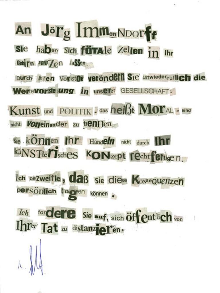 Das Projekt “Briefe 1-4” bilden vier Briefe, die in ihrem Inhalt zwei Künstler und zwei Wissenschaftler ansprechen, die sich mit verschiedenen Aspekten der Genforschung beschäftigen. Die Briefe legen den jeweiligen Personen nahe, nicht persönlich den Umfang ihrer Verantwortung für die Gesellschaft abschätzen zu können, und fordern sie dazu auf, ihre Arbeit zu stoppen. Sie sind ähnlich eines Drohbriefes, mit aufklebten Buchstaben aus der täglichen Presse, aufgebaut. Zusammen mit einem Titelschild, das Angaben zum Namen des Künstlers (Moritz Fingerhut) und zum Kunstwerk (“Briefe 1-4”) macht, wurden sie innerhalb einer Woche illegal in vier hochrangigen deutschen Museen angebracht. Jeder Brief ist mit “gez. Moritz Fingerhut” signiert und wird in dem jeweiligen Museum so lange hängen bleiben, bis er vom Personal entdeckt bzw. als Fremdkörper entlarvt wird. Die Aktion wurde mit einer Minikamera versteckt dokumentiert.