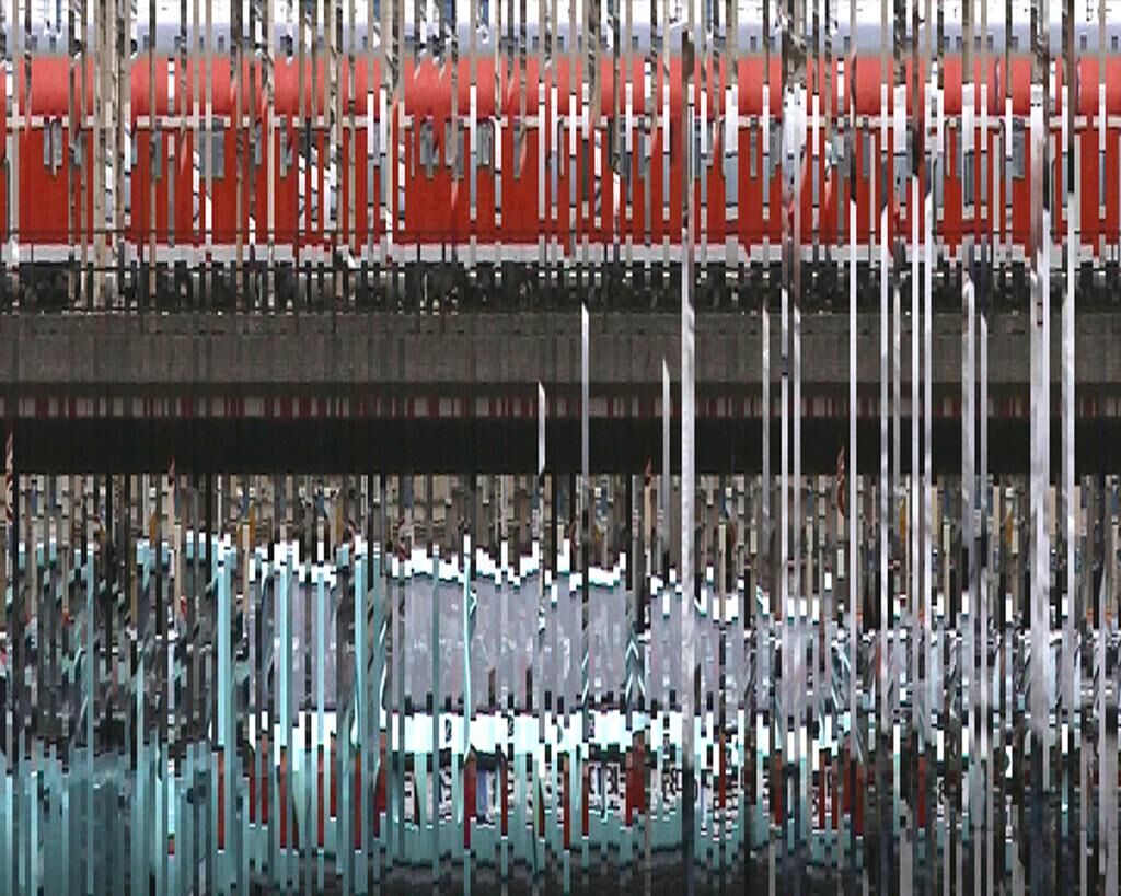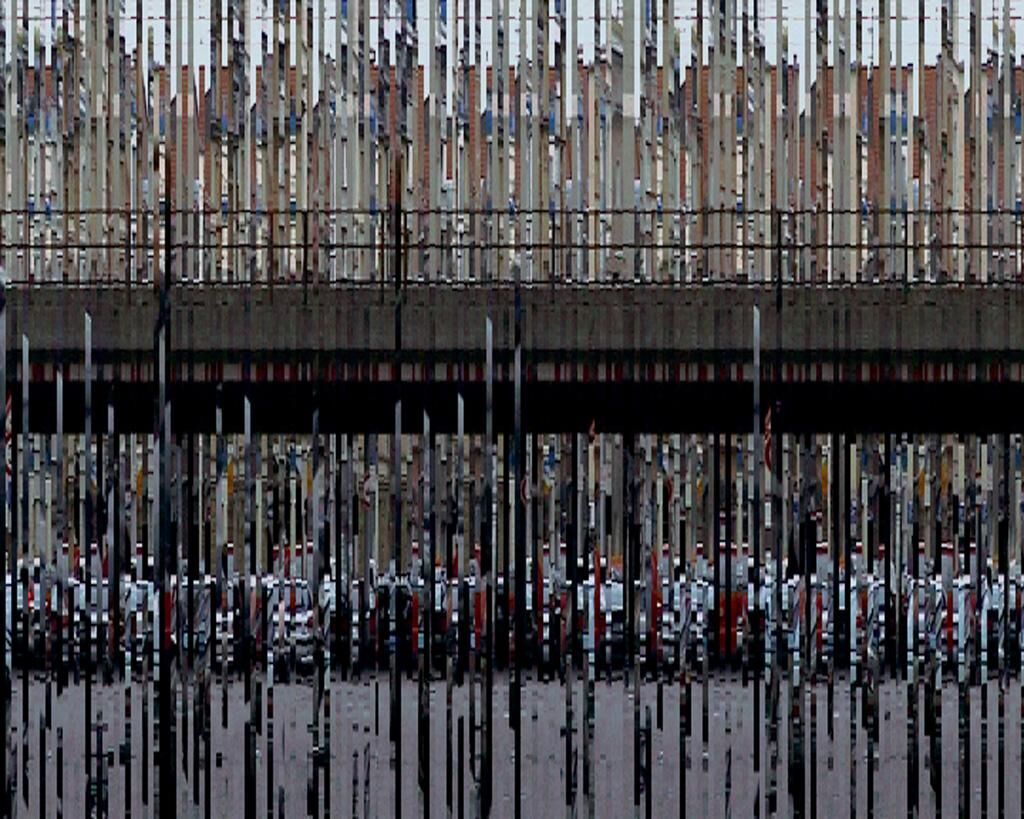 Das Bild einer urbanen Straßensituation zerfällt in vertikale Fragmente. Die Bewegungen der Züge, Autos und Passanten verändern die zeitliche Struktur des Bildraumes. Während sie sich selbst zu einem einheitlichen Bildeindruck zusammenfügen, fragmentieren sie die anderen Objekte. Die Prozesse von Konturgewinnung und Auflösung bedingen sich und tauschen ihre Positionen.