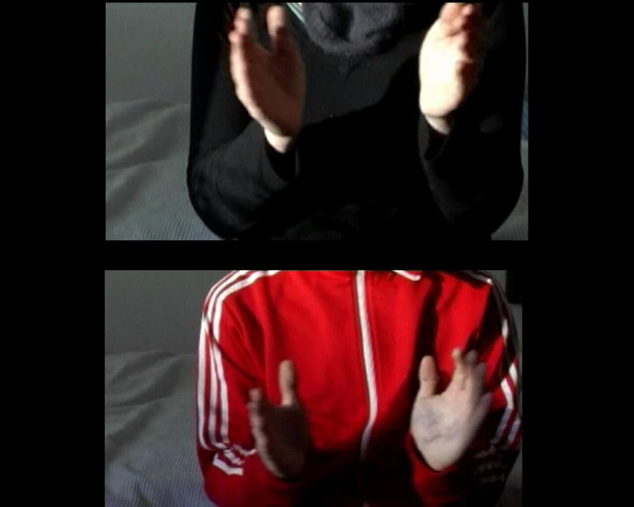 ""Irgendwie schaut´s sogar aus, als würden die beiden die Bewegung falsch herum ausführen. Aber ich schwör´s, ich hab wirklich immer nur den einen Frame entfernt."" Mit einem minimalen Eingriff in ein Video habe ich immer genau den Frame des Zusammenkommens der Hände zweier klatschenden Personen entfernt. Durch die Manipulation können die beiden versuchen, sich in geloopter Unbändigkeit gegenseitig zu beklatschen. Allerdings werden sie es nie tun.