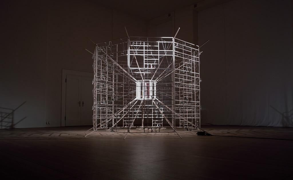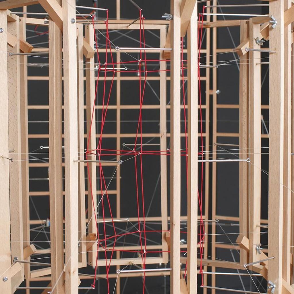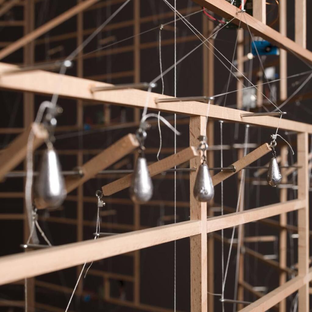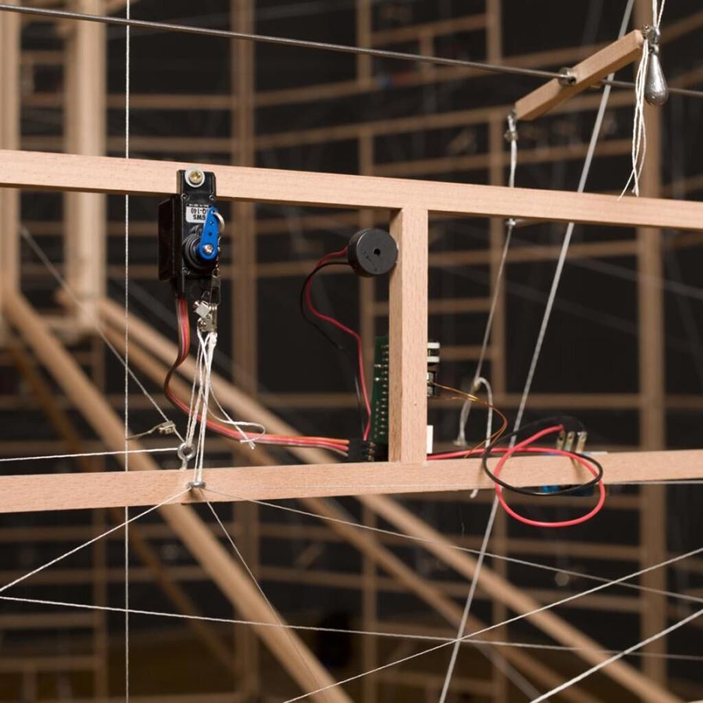 The inverted machine, Rechnender Raum (Calculating Space), is a lightweight sculpture, made of sticks, strings and plumbs. But it is also a fully functional, logic exact, neural network, which computes the basic Boolean functions of NOT/AND/OR. Through its strict geometric and filigree construction, the observer is able to track its logic processing from any angle. In contrast to a normal layout, with an external user interface and the logic elements hidden within, this calculator is turned inside out. The core of the machine, with all its computing elements, is at the surface, while the ‘display’ indicating the results is at the centre of the system. As such, no matter how carefully one studies the interaction of the elements, with their steady, reassuring buzz, it is not possible to follow or understand the conditions the machine is working with; it is both completely transparent and yet strictly self-referential, as if it has a secret all of its own.