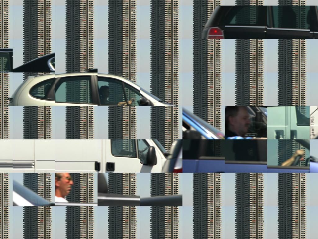 Skyscrapers rise up out of nothingness. Cars roar past, without even touching the ground. The whole picture is hanging in abeyance. A continuous zoom-out expands the view of the scene, crossing the space between near and far, fading from concrete to abstract, from tangible to intangible. The music meanders around the image, picking up on visual movements, following them for a while before breaking off and following its own rhythm. Beginning with pumping bass sounds, the tone rises continuously until finally becoming almost inaudible.