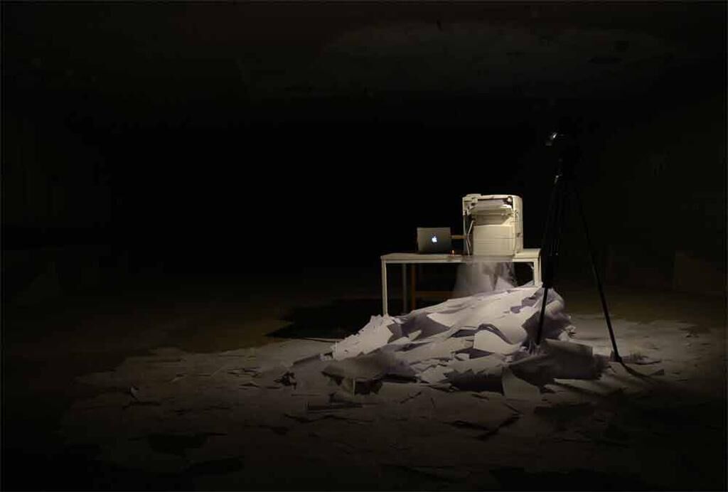 The listing of more than 4 billion results under the keyword „GOD“ were printed from Google during a 5-day group exhibition in the Deutzer Bridge in Cologne, Germany. The piece was set up with some everyday objects – a table, a lamp and a printer - that over the duration of the exhibition literally disappeared under a drifting mountain of regularly printed sheets of paper. „GOD“ describes an obsessive search for God in the network’s data, whose endless results become no more than waste.