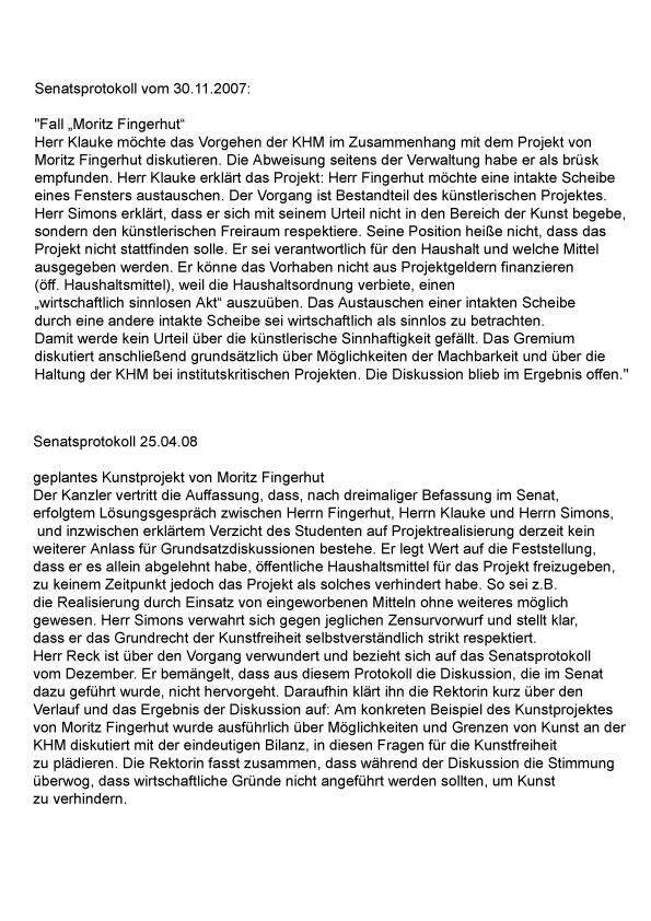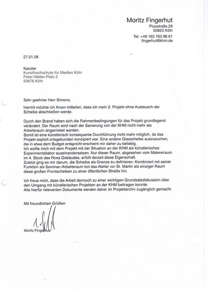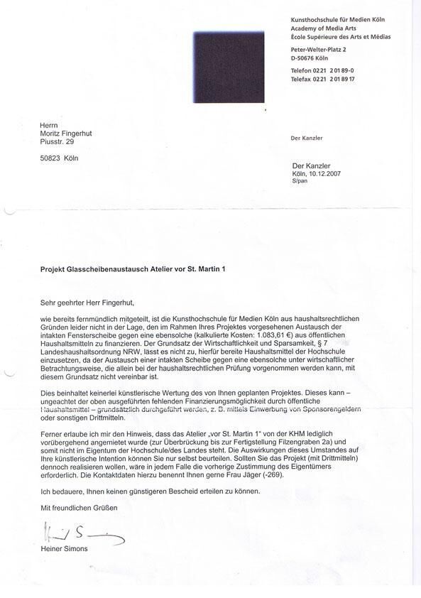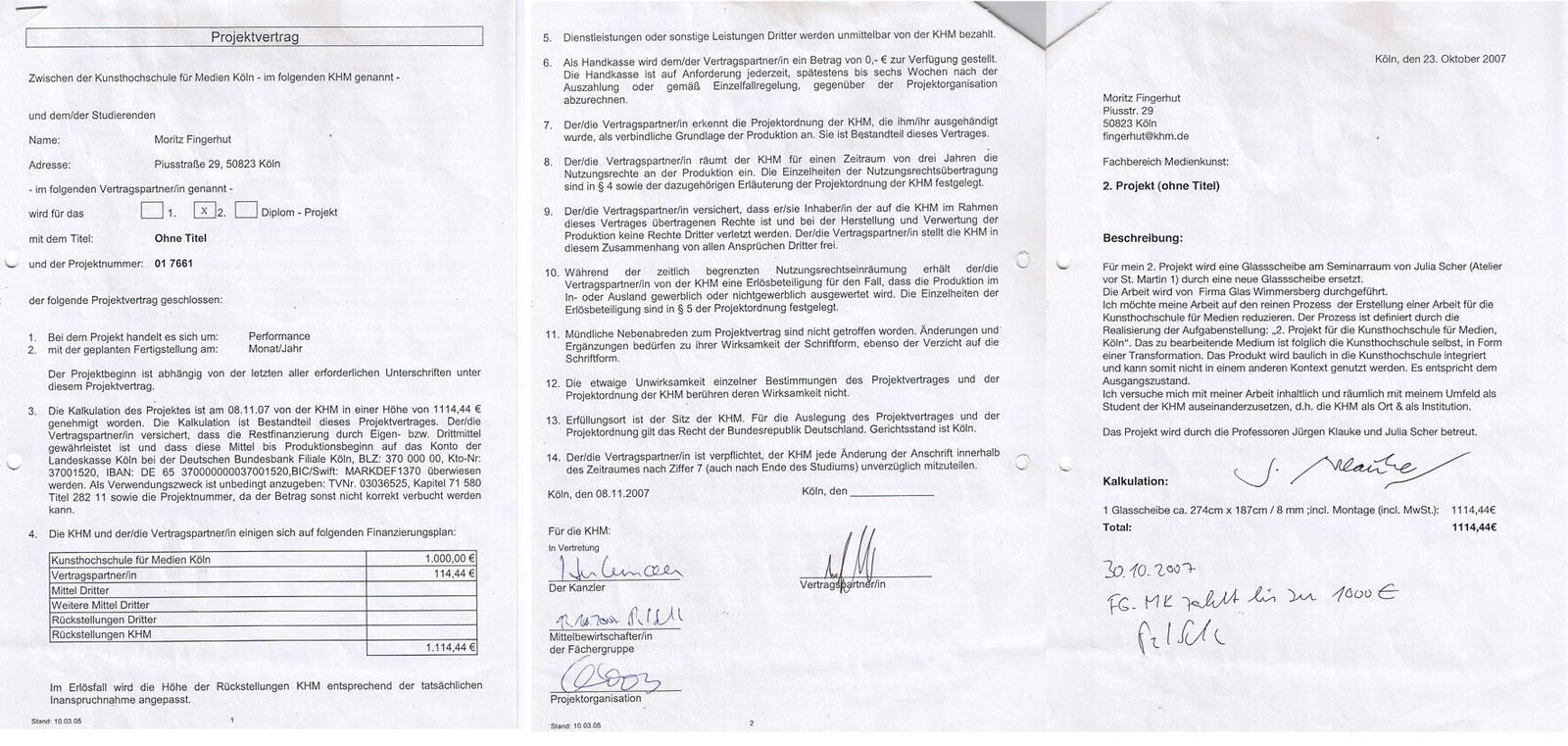 Für mein 2. Projekt wird eine Glasscheibe am Seminarraum von Julia Scher (Atelier vor St. Martin 1) durch eine neue Glasscheibe ersetzt. Die Arbeit wird von der Firma Glas Wimmersberg durchgeführt. Ich möchte meine Arbeit auf den reinen Prozess der Erstellung einer Arbeit für die Kunsthochschule für Medien reduzieren. Der Prozess ist definiert durch die Realisierung der Aufgabenstellung: „2. Projekt für die Kunsthochschule für Medien, Köln“. Das zu bearbeitende Medium ist folglich die Kunsthochschule selbst, in Form einer Transformation. Das Produkt wird baulich in die Kunsthochschule integriert und kann somit nicht in einem anderen Kontext genutzt werden. Es entspricht dem Ausgangszustand. Ich versuche mich mit meiner Arbeit inhaltlich und räumlich mit meinem Umfeld als Student der KHM auseinanderzusetzen, d.h. die KHM als Ort und als Institution. Das Projekt konnte wegen eines Brandschadens im Seminarraum von Julia Scher nicht durchgeführt werden.