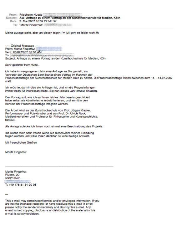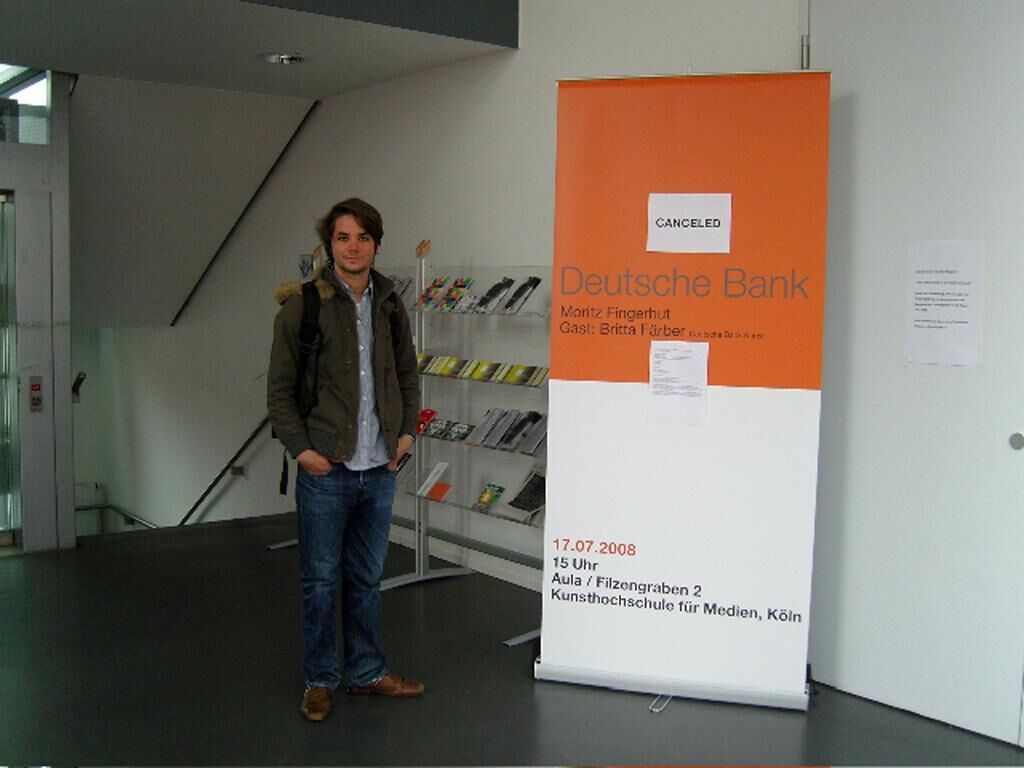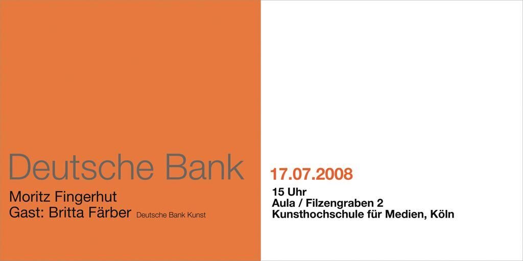 Moritz Fingerhut - Deutsche Bank, 2008 17.07.08, 15 Uhr, Aula Gast: Britta Färber, Deutsche Bank Kunst Die Deutsche Bank besitzt mit heute über 50000 Werken die weltweit größte Unternehmenssammlung und ist sowohl national als auch international maßgeblich als Förderer in der bildenden Kunst aktiv. Moritz Fingerhut lädt die Deutsche Bank Kunst, vertreten durch Britta Färber, ein, um das Spannungsfeld zwischen Kunst, gesellschaftlichem Engagement, Bildung und Wirtschaft auf der Jahresausstellung 2008 der Kunsthochschule für Medien Köln zu thematisieren. Frau Färber musste aus gesundheitlichen Gründen kurzfristig absagen.