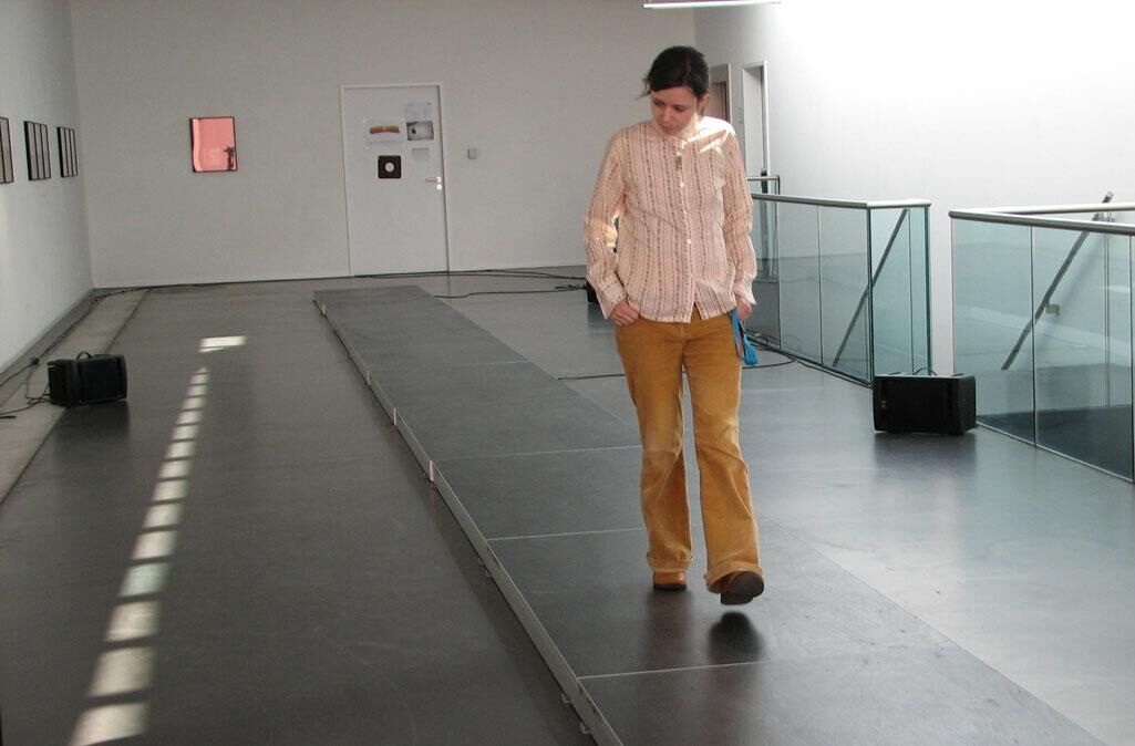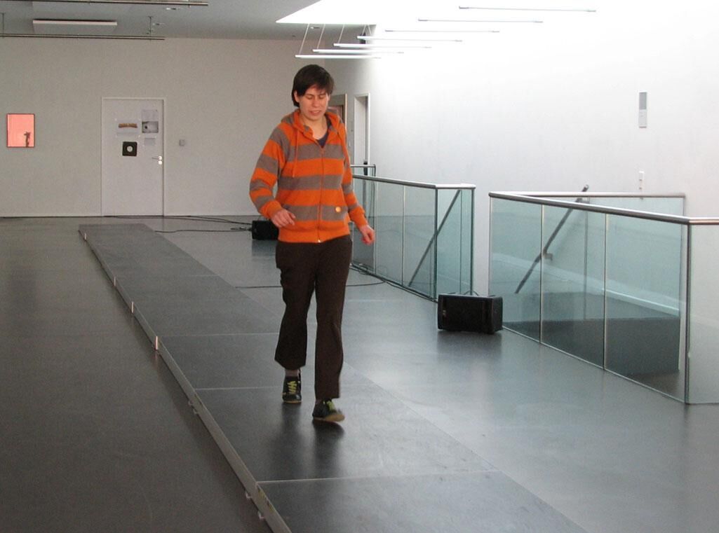 This is an interactive sound installation which is activated by the walking of people. When people walk on the catwalk, sensors react to the footsteps, and make the electric sounds which imitate the walking rhythm emit from the speaker system. You will feel as if your own footsteps are following you. The electric footstep sounds are stored in the computer and looped. As more and more people walk, they will form music with a three-dimensional effect. The rhythm adopted by this system is two-beat, which is the basic beat when people walk with two legs. The walking rhythm differs from person to person, so when many people's walking patterns accumulate, density of the music is obtained. The primitive two-beat music has a cosmic mood, and resembles African music.