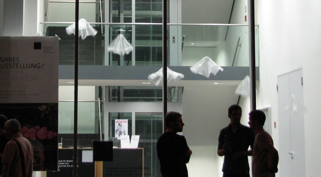This is an interactive installation in which small parachutes move up and down in the air, as if jellyfish are swimming in the water. The parachutes move away from someone who approaches them. It lets viewers feel invisible air, space, and time. Eight parachutes are installed in front of a window, being hanged by a fishing string. A step motor winds them on a reel to control the parachutes moving up and down. In each parachute, a sensor is installed to detect the approaching figure around it. The movement of parachutes is intended to imitate the movement of jellyfish, using the air. When a parachute moves up and down, the air comes into it, and it billows out and deflates in the air.
