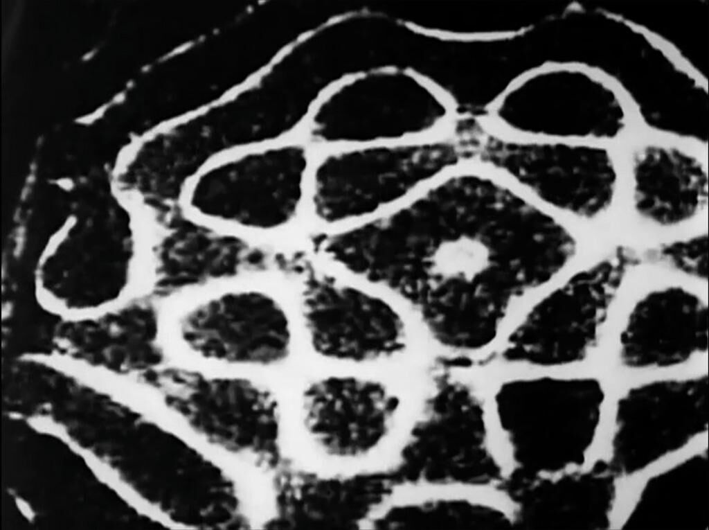 Description: When this film is projected, a portion of each image is reproduced as optical sound. The film is a composition, an arrangement, but not one that is strictly from visual to aural, or the other way around, but for both of these senses at the same time. If you were to cross the nerves of the eye and the ear with one another, the eye would hear lightning as a loud crashing boom and the ear would see thunder as a bright flash of light in the darkness. Statement: Ernst Florens Friedrich Chladni drew a violin bow across the edge of a piece of metal whose surface was lightly covered with sand and visually demonstrated modes of vibration. A Super16mm film camera records images on the area of the film normally allocated to the soundtrack. If a Super16mm film is played in a regular 16mm projector, the images just off-screen to the right are reproduced as sounds, also demonstrating modes of vibration, but in an inverted scheme