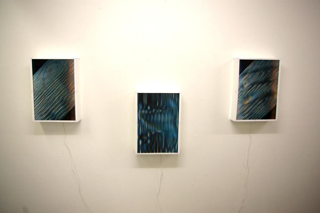 In den Lenticular-Scannographien wird die Beziehung von Licht (bzw. Reflektion) und ""Zeit & Bewegung"" erprobt: Das vom Scanner emittierte Licht wird als Reflektion der Lenticularfolie wieder erfasst. Der Scanner als „Input-Medium“ ermöglicht dabei ein Experiment des veränderbaren Bilderfassungszeitraums und die Lenticular-Technik als „Output-Medium“ lässt den in Bewegung versetzten Betrachter rätseln, ob die Reflektionen das eigentliche Bildmotiv sind oder von der aktuellen Raumbeleuchtung. Technische Angaben: Die Arbeit besteht aus 3 Leuchtkästen zu jeweils 54 x 38 x 11 Zentimetern.