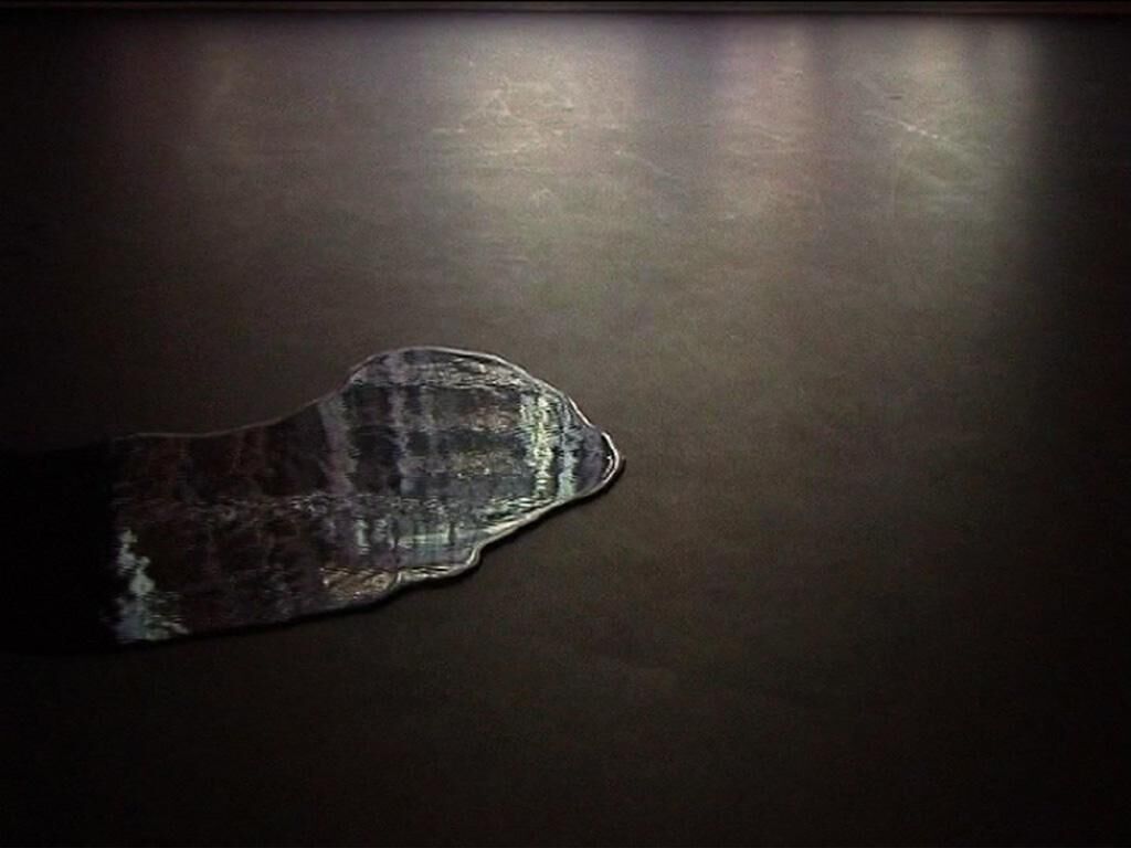 In the video piece 'Staircase Flesh', a grey concrete floor is projected onto the gallery‘s identical floor. The image slowly conveys information into the grey frame, where a reflection of water flows into a puddle drawing a visual field that is constantly changing. After a few seconds, the puddle freezes into a bright crystal, and for a brief moment, encourages the viewer to gaze at the sutured image projected: The artist walking down metal steps in a repetitive movement, scaling down into the abyss.
