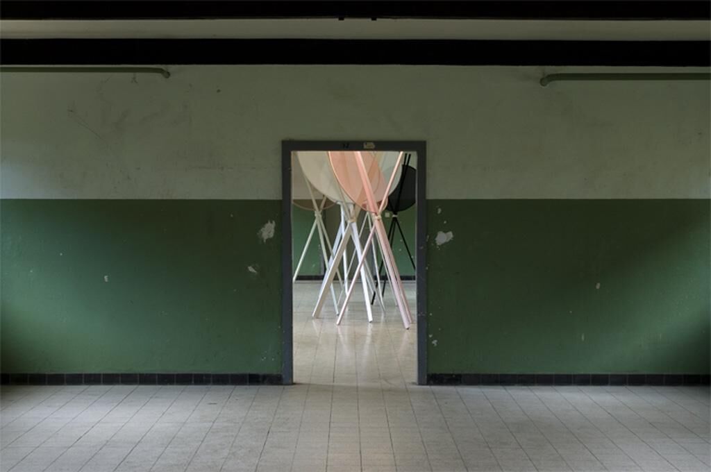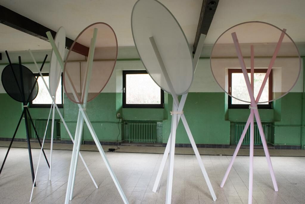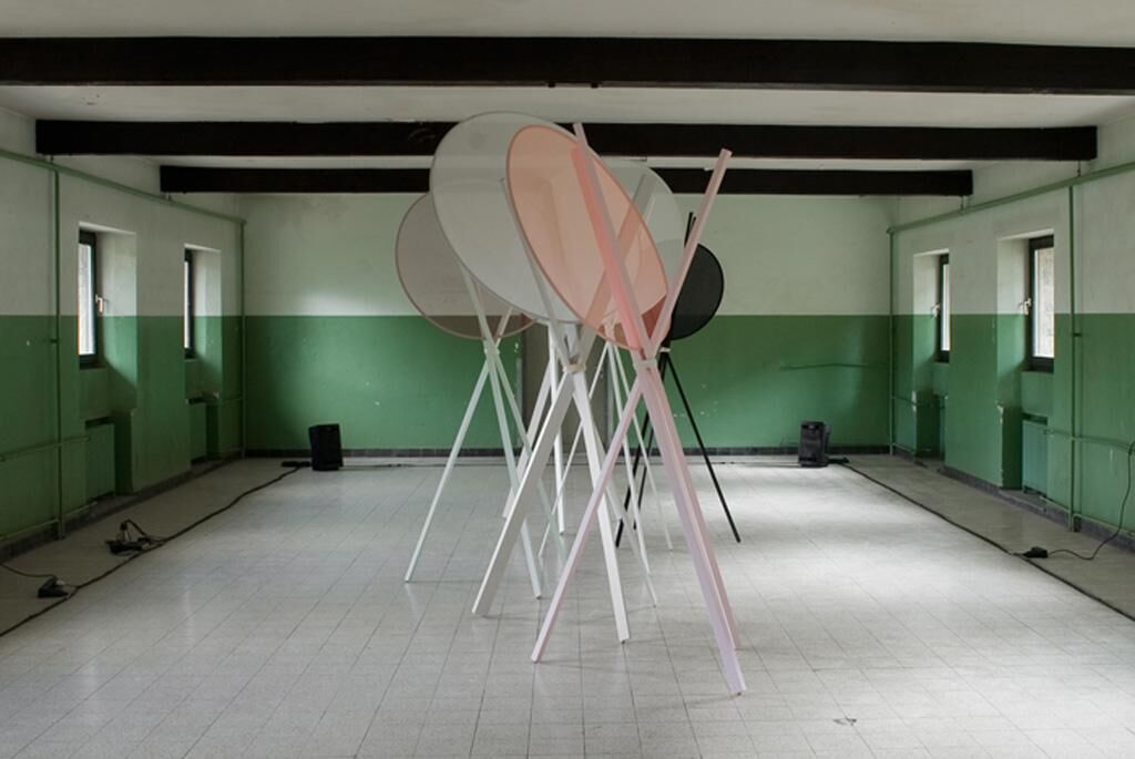 The installation consists of six sculptures and one audio track. Each sculpture is made of three wooden slats constructed as tripods, holding a circular frame with semi-transparent fabric stretched over it. The frames are in analogy with pop filters which is an anti-pop noise protection filter for microphones, typically used in a recording studio. Each unit is in pastel colors, black or white. A sphere of sound surrounds the constellation of 6 pieces: Through the loudspeakers located at every corner of the dormitory hall, improvisations of harp music (co-produced by Beatrice Martini) is to hear. The work is a response to the historical context of the dormitory, which belongs to the former Nazi Ordernsburg Vogelsang. The training camp was used by the National Socialists between 1936 and 1939 as an educational centre for future leaders. Besides of functioning as simple sleeping halls for young men, the dorm was also designed to compress the living space of each person. Its aim was to remove any individuality and the creation of a collective consciousness. The individual process of sleeping, which belonged to the daily activities inside the building, is indispensable for developing a personality of a young man. Sleeping generates a free and non-controllable thinking and seems to be the only moment of interferance with the ideology that dominated the space. This idea of sleep is represented in the sculptures and the harp music. They both deconstruct the heavy and monumental architecture of the building by creating a free and floating expression. The site-specific installation reflects the relation between individualism and collectivity, in consideration of the past and the present.